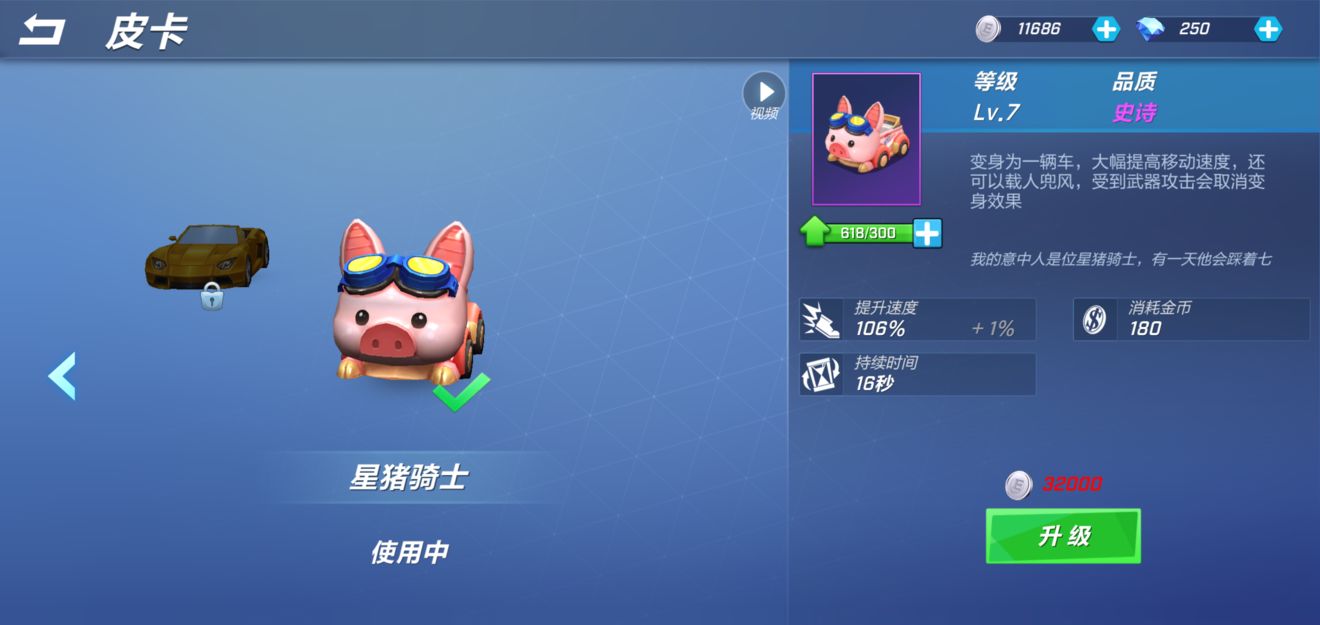 皮卡,消耗180金币,持续时间16秒,增加速度随等级提高而提高。