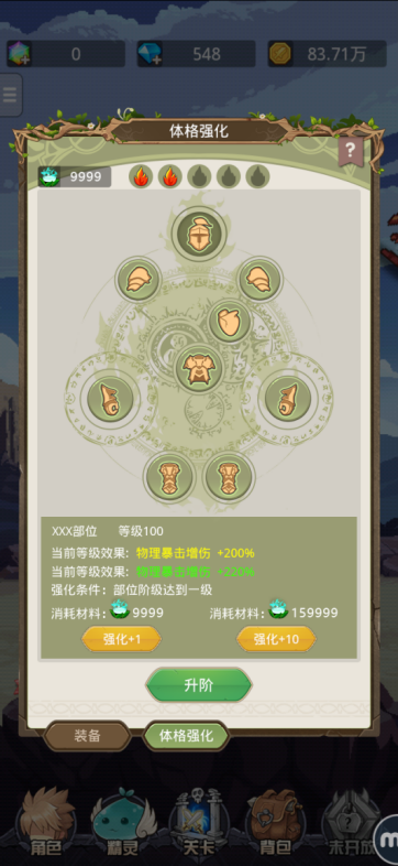 勇者一共有9个身体部位可以进行体格强化,每个部位都会有不同的加成属性,不过受到精华萃取的限制,只有所有的身体部位都达到了一定的强化等级,才可以进行升阶,从而提升各个部位体格强化的等级上限。