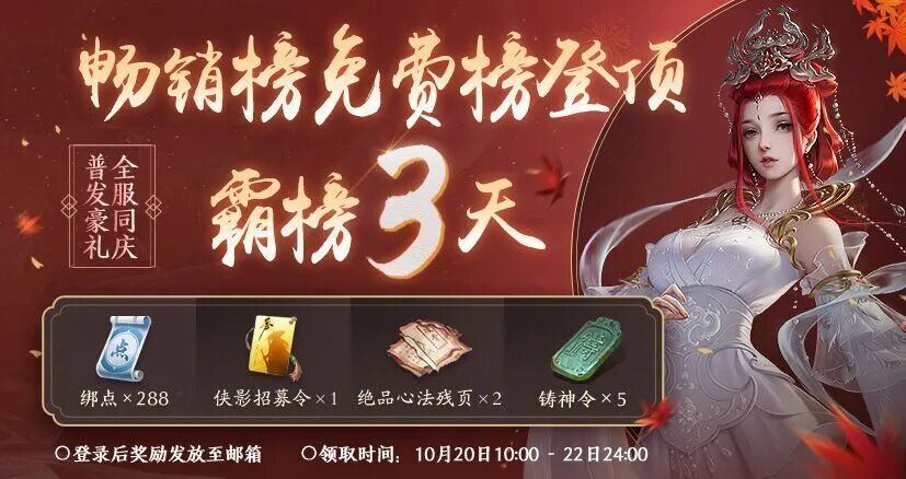 因此特为各位少侠准备了快乐礼包——288绑点,侠影招募令*1,绝品心法残页*2,铸神令*5,以庆贺天刀手游登顶霸榜畅销榜和免费榜三天以上!