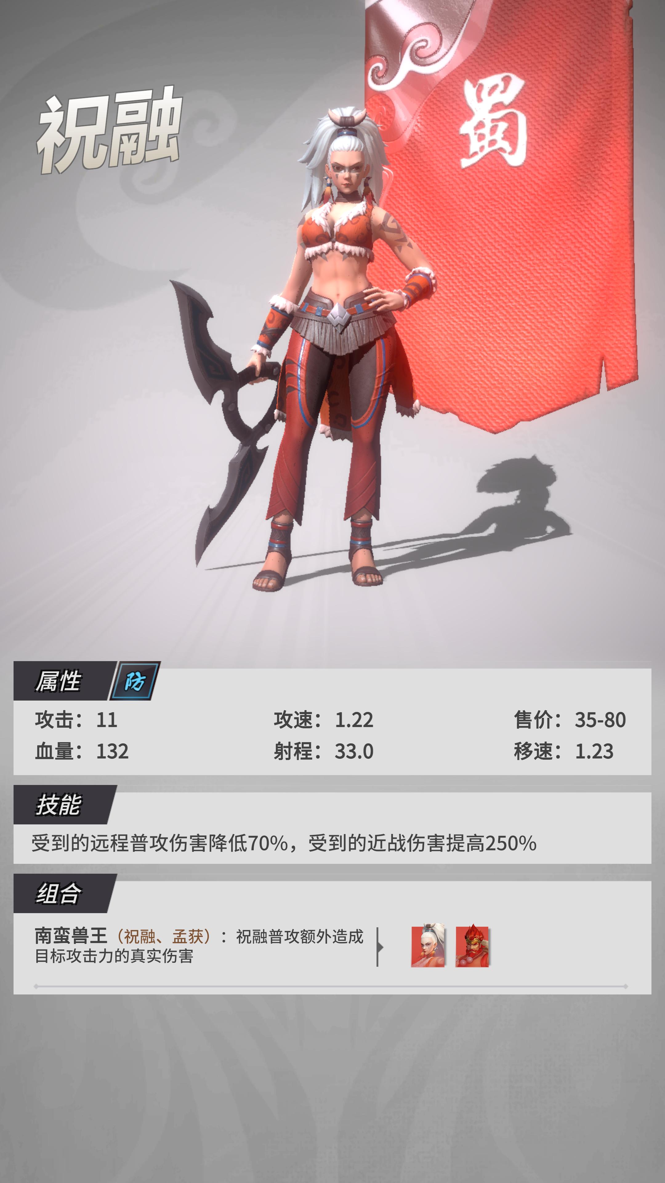 《战三国 八阵奇谋》的蜀国阵营里,五虎上将的羁绊技能十分强大,然而孟获与祝融同时上阵也是十分有用的组合。孟获的技能,可以让他大幅降低受到的远程普攻伤害、额外受到法术攻击的伤害;祝融的技能同样能大幅降低受到远程普攻的伤害,却会额外受到近战攻击的伤害。正如史实上的南蛮将士,身着藤甲无惧远程伤害,这两位武将在场时冲击敌方远程攻击武将,也能起到奇效。