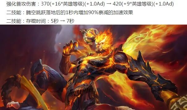 孙悟空加强:被动前期伤害增高,被动后期伤害降低,2技能新增加速效果,2技能存棍时间增加两秒。总之就是,孙悟空的强势期前置,前期伤害更高,灵活性更强,操作难度更低,前期可以获得更好的发育。