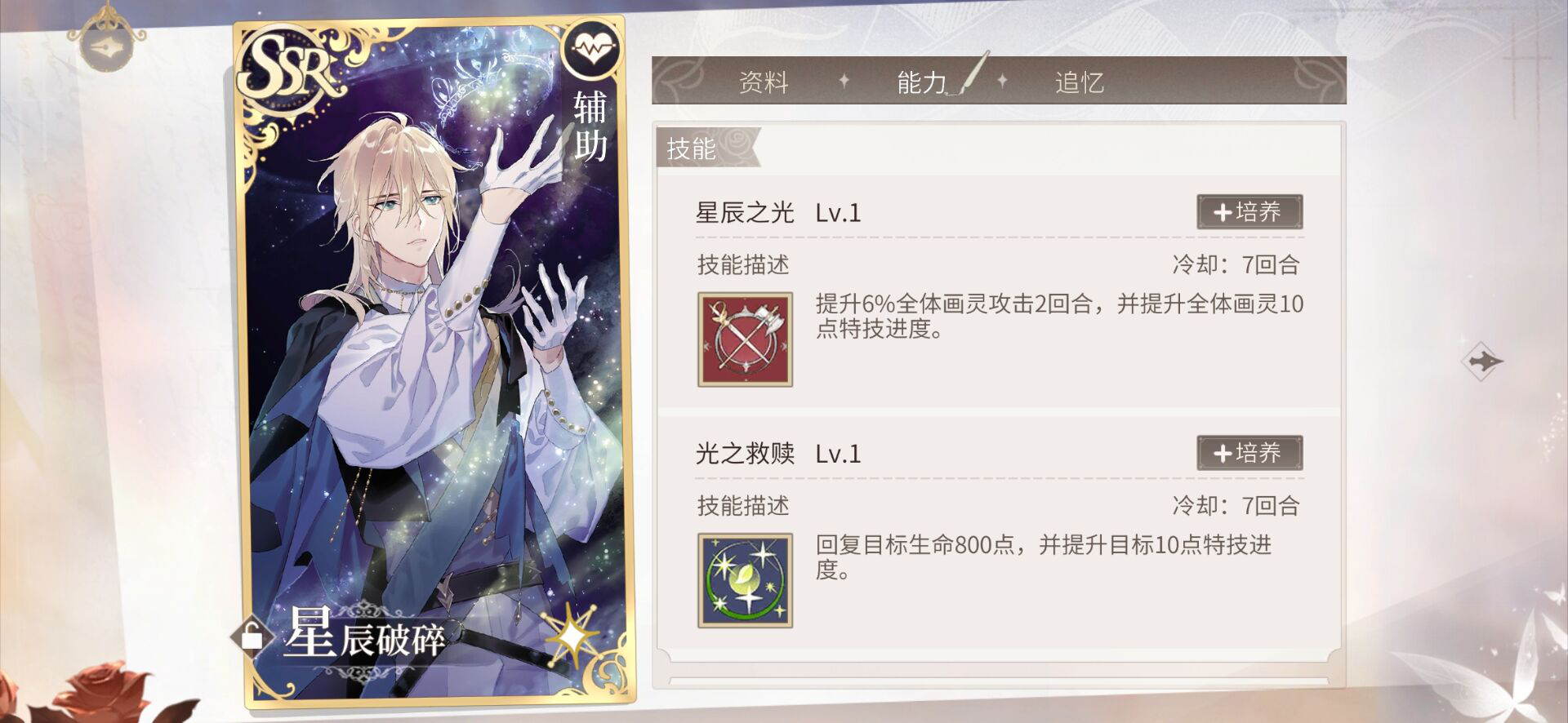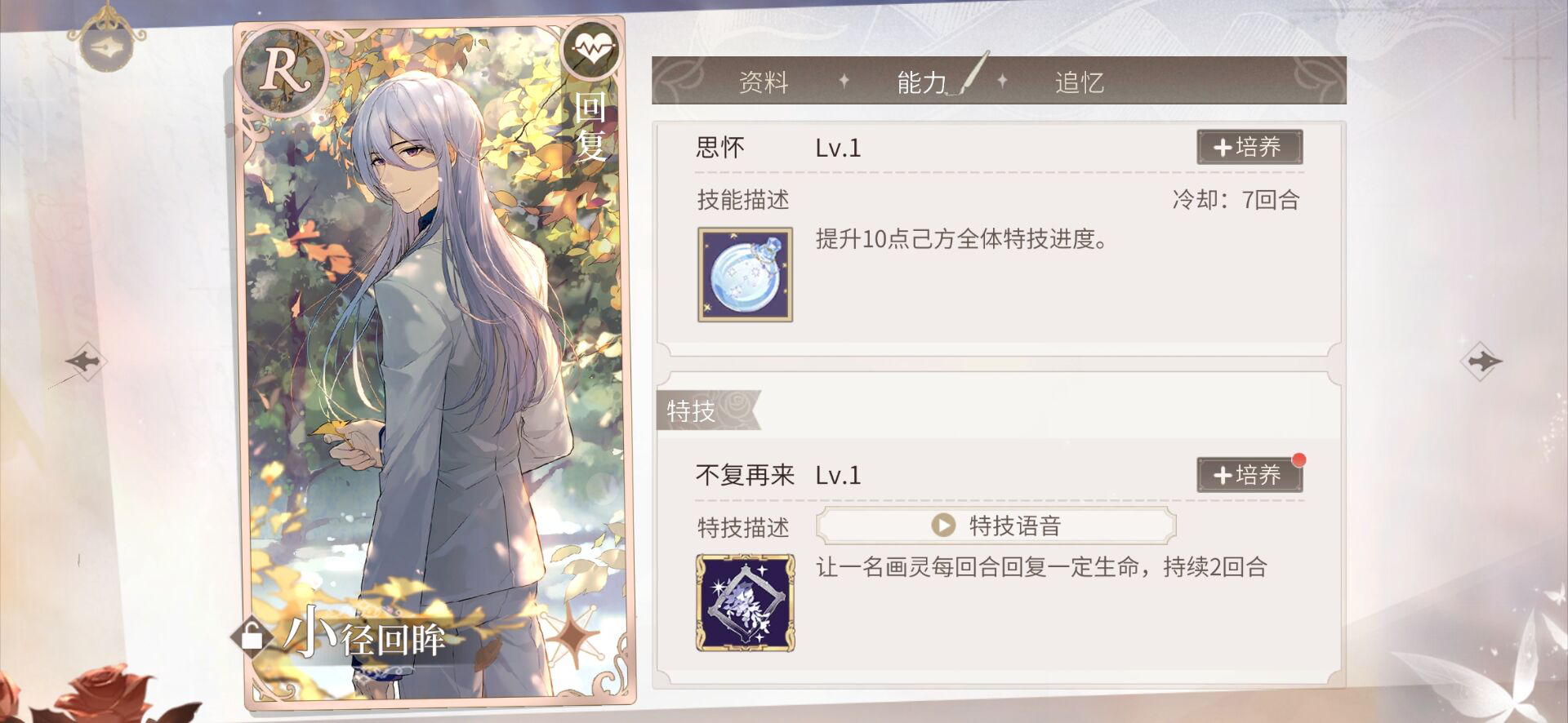④接下来就是最后一张卡牌啦,这个就是我们做为第四张出手的回复卡,都还记得我跟大家说过这张卡牌的重要性吧,所以这张卡牌最好去挑选群治疗的,如果没有单体治疗的也是可以的,但必须要那种持续性加血的,当然如果有辅助卡的加血效果要比回复的好也是可以代替上场的,这张卡其实我并不要求是多好的加成卡牌,最主要的就是加血,哪种加的越多就让哪种上场。