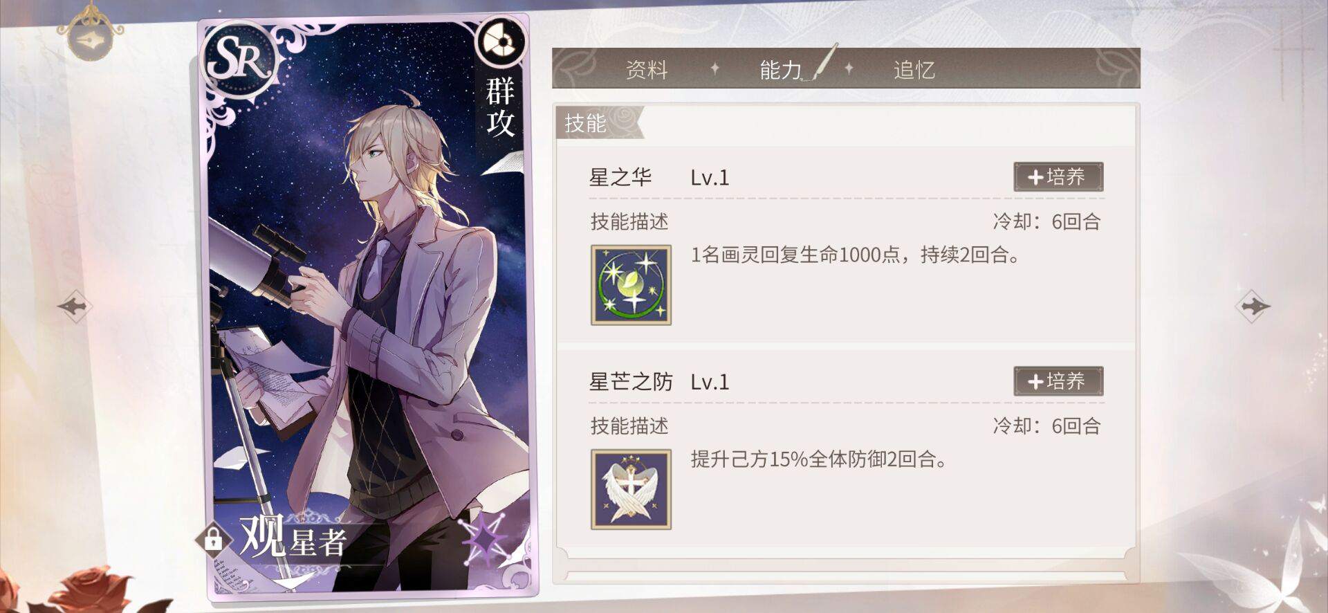 ③群攻卡,有很多小伙伴就会说了,你不是不推荐群攻卡么?为什么这里要说群攻卡呢,各位小伙伴请注意哈,这里的群攻卡我是把它当成辅助卡用的,如果大家手上有这张“路辰SR的观星者”就不要刚才我所说的辅助卡了,就直接把这个卡当成辅助卡使用就好了,这张卡的效果就是可加血,可拉BUFF还可以群攻,做为我心目中的理想辅助卡这个真的很不错。