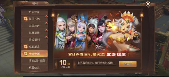 完成爵位任务即可免费获得解封神将魔·夏侯渊,充值1元即得最强辅助神将仙·吴国太,自动复活带无敌,更额外加送绝版超萌金将典满、宝石大礼包等豪华道具奖励。充值满10元即获赠10连招募武将机会,更有#G紫龙玉珏、秘宝钥匙、萌萌兔耳朵#l等价值300元大礼包等你来拿!