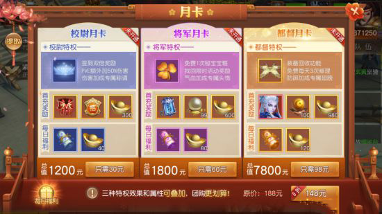 充值校尉月卡、将军月卡、都督月卡分别可领取#G1200、1800、7800元豪华礼包,金色装备、金色宝物等超强道具一步到位,9大顶级特权轻松暴虐土豪。