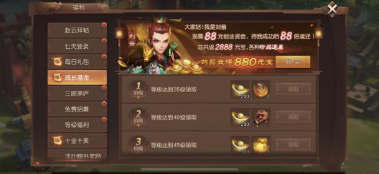 只需花费88元购买成长基金,即可畅享高达88倍的元宝返还和五连抽机会。等级越高返还越多,总共返还总价值6888元宝的元宝、珍品装备、金色宝物奖励!