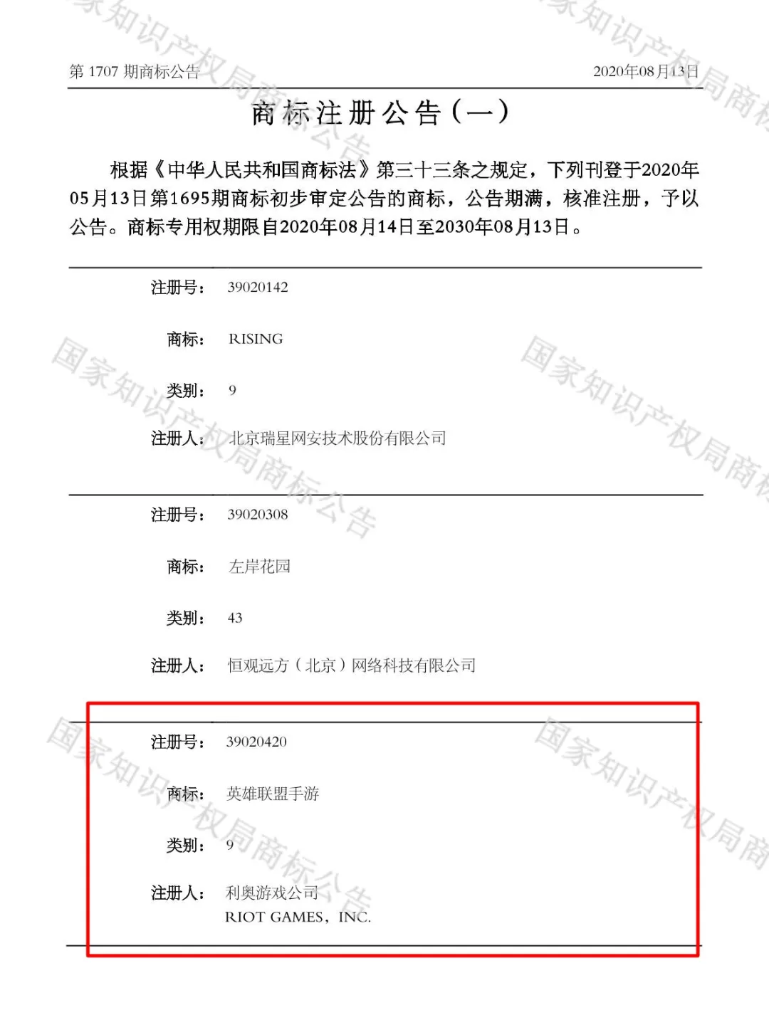 实际上,拳头申请《英雄联盟》手游商标确有其事,并且商标在近日正式申请成功。根据国家知识产权局商标局公示的结果显示,《英雄联盟》手游已在国内核准注册商标,注册号为39020420,类别9,注册人为利奥游戏公司(RIOT GAMES)。商标专用权期限自2020年8月14日至2030年8月13日。
