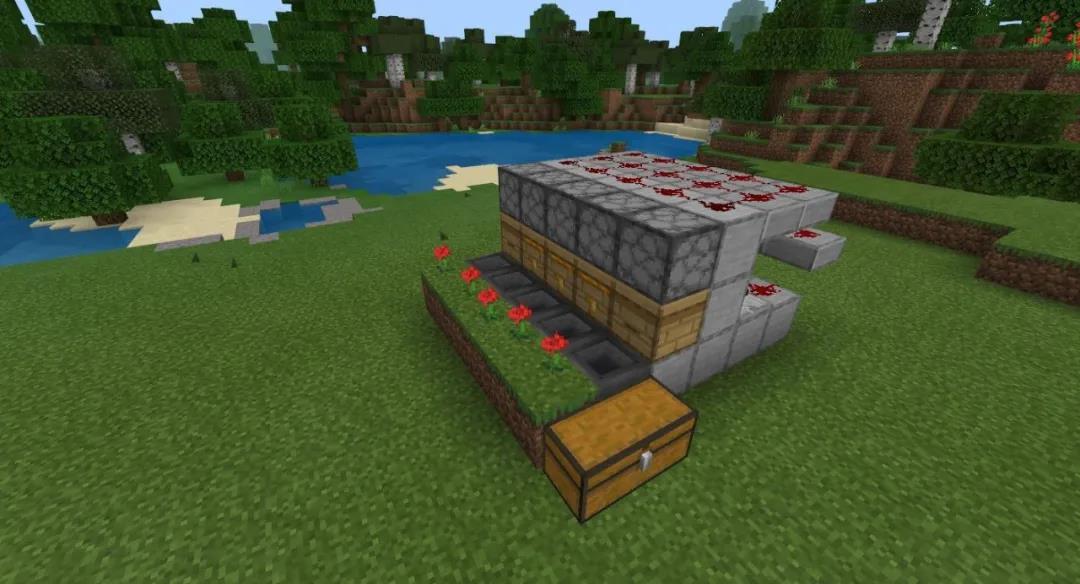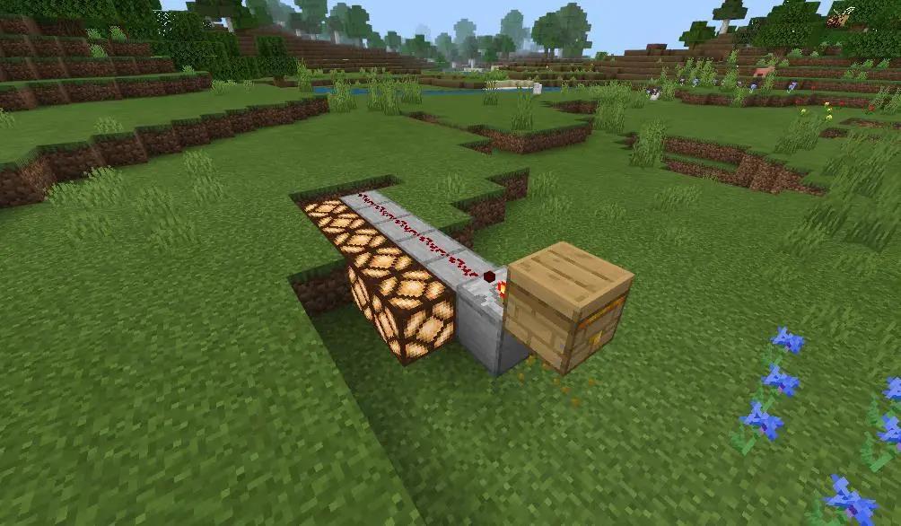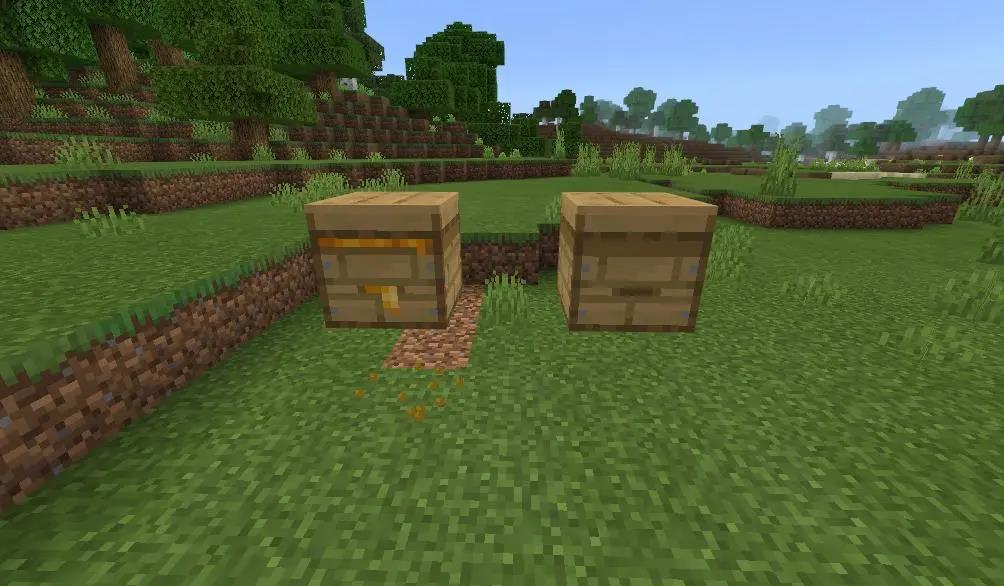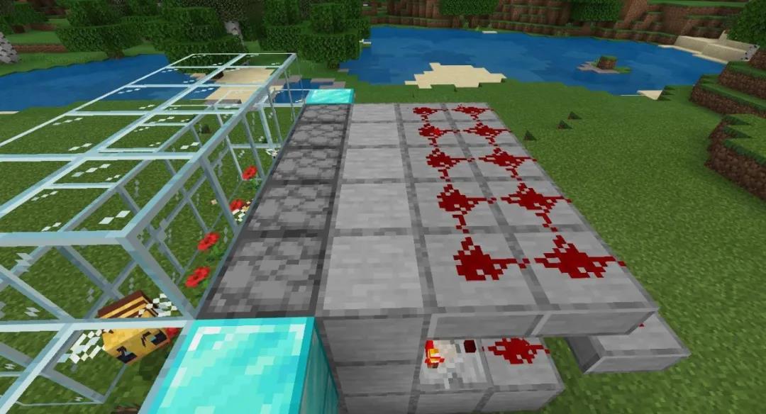 接下来在蜂箱的下面和后面,放置一些普通方块(图中使用了平滑石头)
