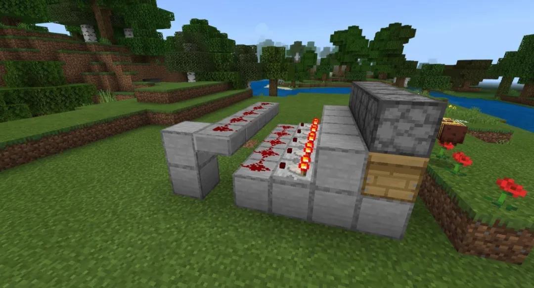 插个小知识~使用台阶是因为,它可以让上下层的红石粉连接起来,并且不会对红石的信号强弱产生影响(台阶替换成玻璃也有同样效果)