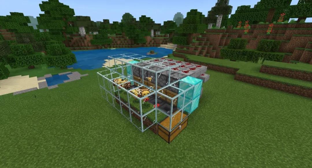 使用玻璃,将采蜜机的前部包裹一下,最外层的发射器和蜂箱两侧用方块堵住,防止收集的蜂蜜瓶被挤出来(如果足够富裕也可使用钻石块~)