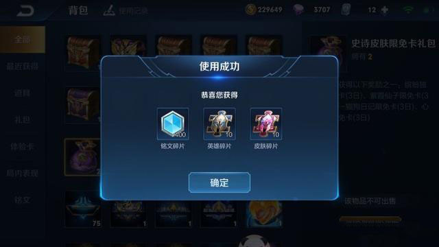 随阿冷一起看下打开所有礼包后都有哪些收获吧!首先我们打开10个耀字礼包,获得了400个铭文碎片、10个英雄碎片以及10个皮肤碎片。这个礼包的奖励虽然是固定的,但是小编推荐大家优先兑换,因为其他礼包开出英雄碎片和皮肤碎片的概率很小。然后我们又依次打开了剩余的礼包,总共获得了2003个铭文碎片,18个英雄碎片,10个皮肤碎片。