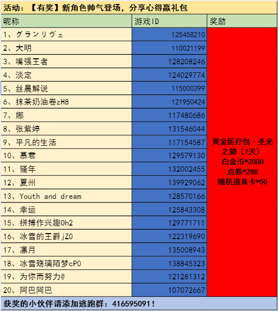 请以上获奖的20位玩家三天内加入233逃跑吧少年交流群联系管理员极夜(备注3月12号活动兑奖)确认你的游戏ID,以便于奖励能发放正确!