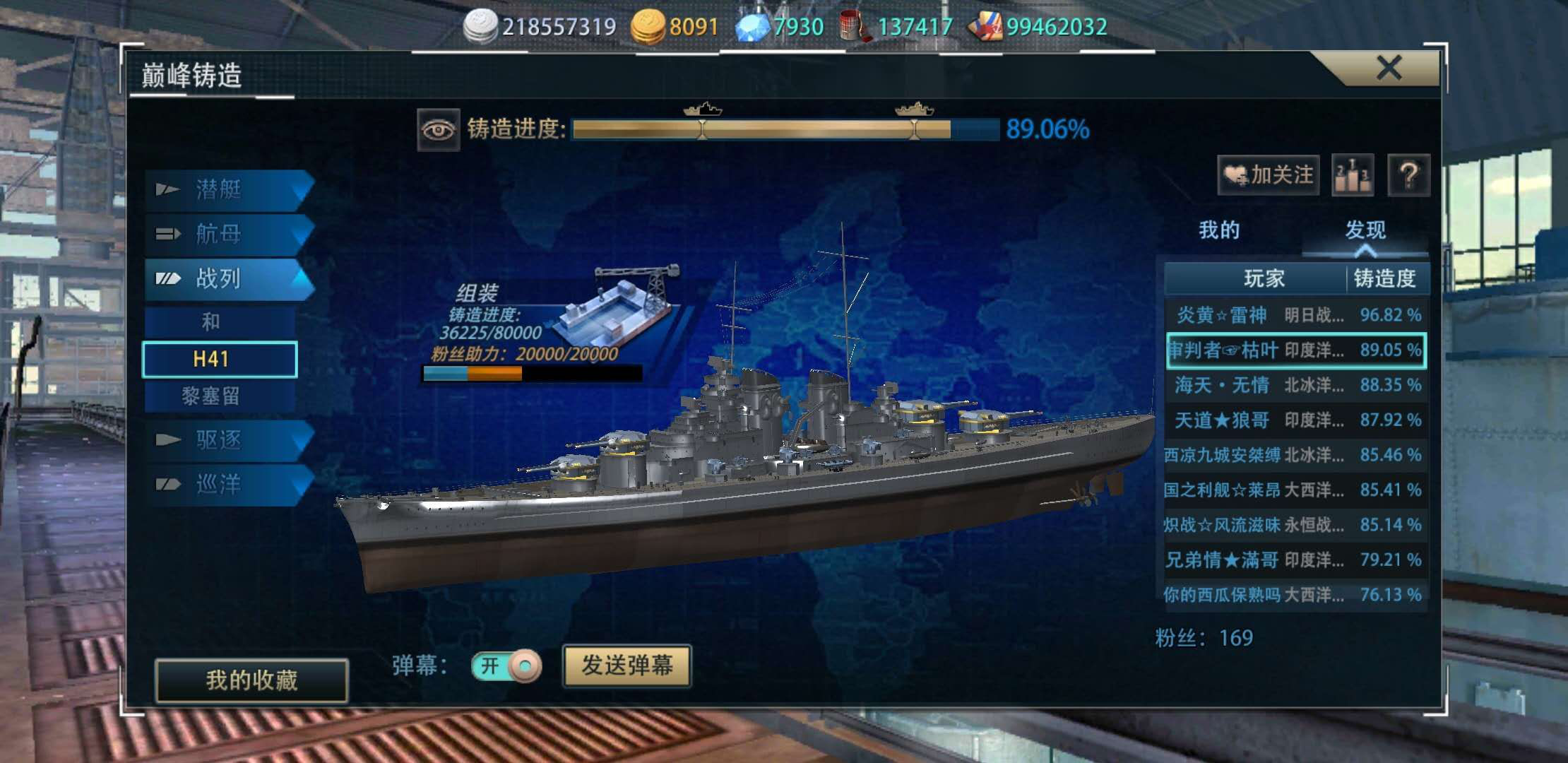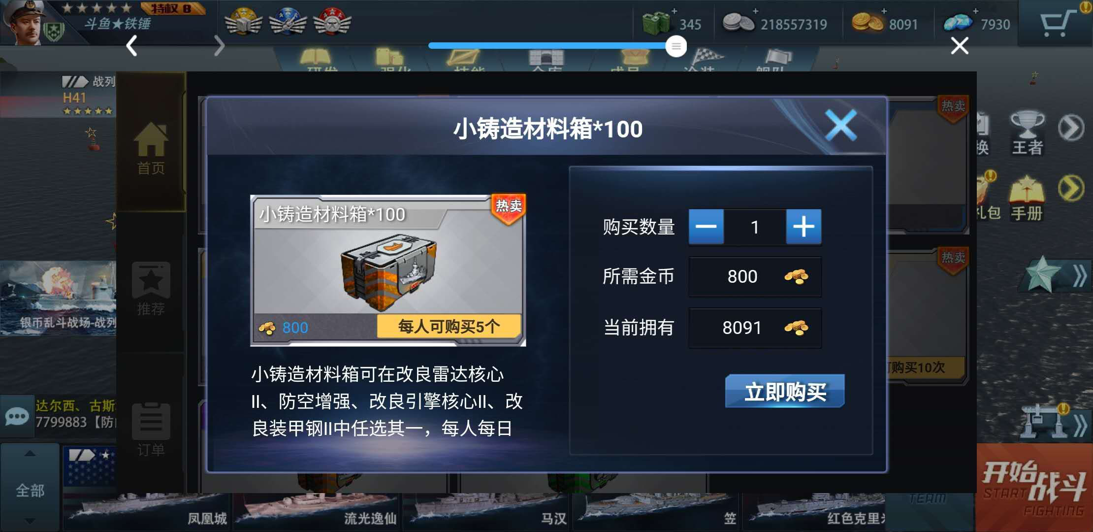 首先,铸造分为探测、动力、武器、舰体和组装五大块,以铸造41为例(下面都以41为例来说明,就不在一一列举了),每块需要铸造点八万点,共计四十万点。其中每块都可以找朋友助力两万点(别管有偿还是无偿),这些助力是很必要的,可以大大缩短我们的铸造过程,必须搞。