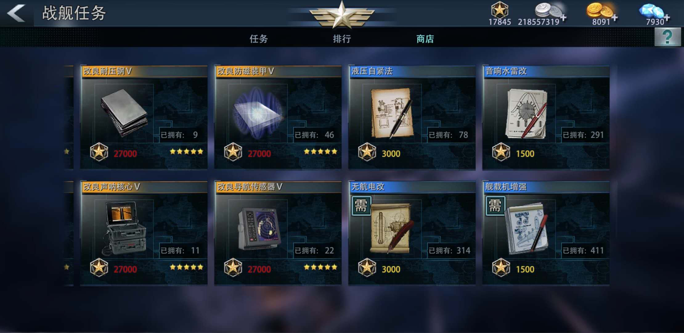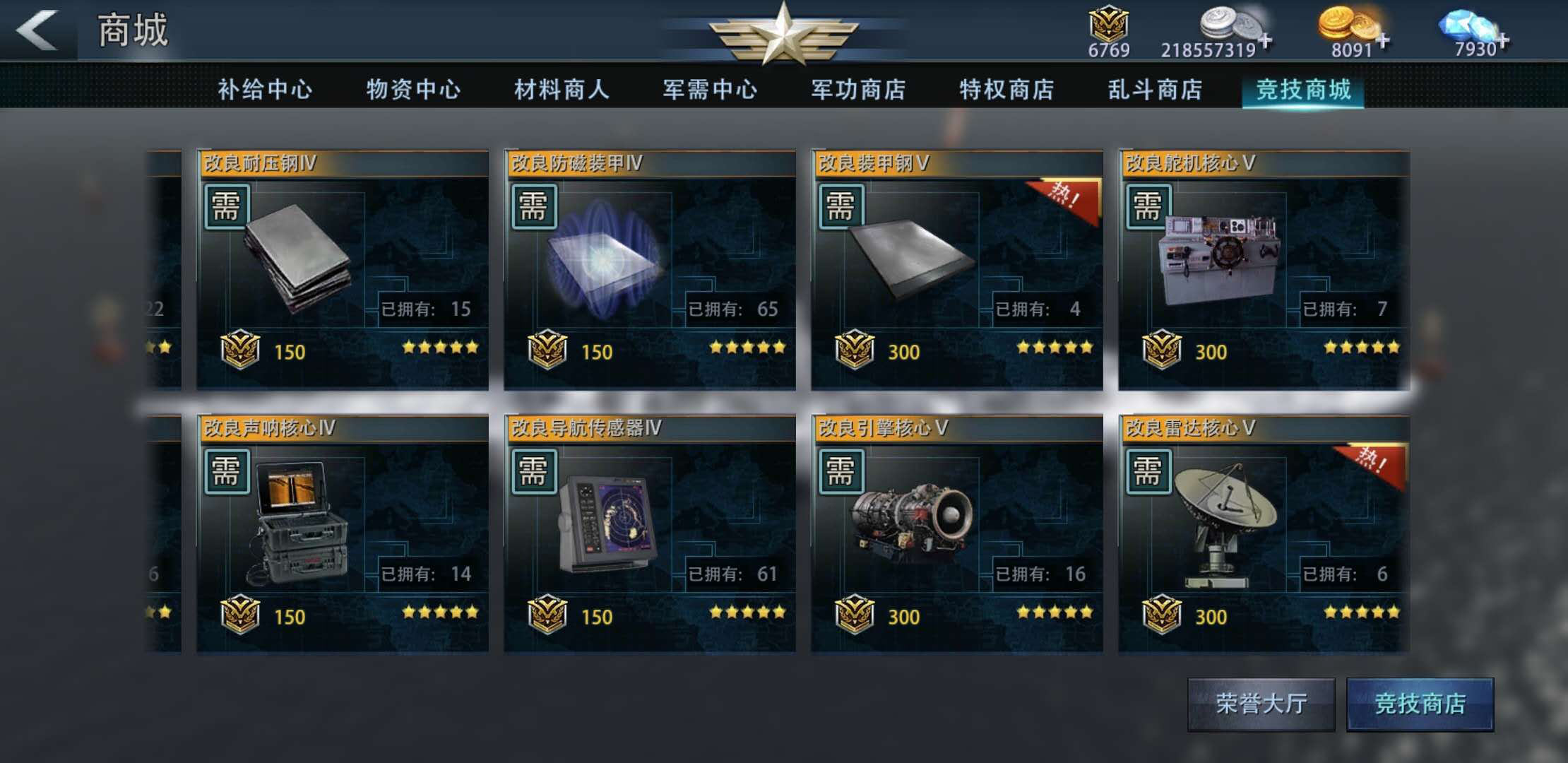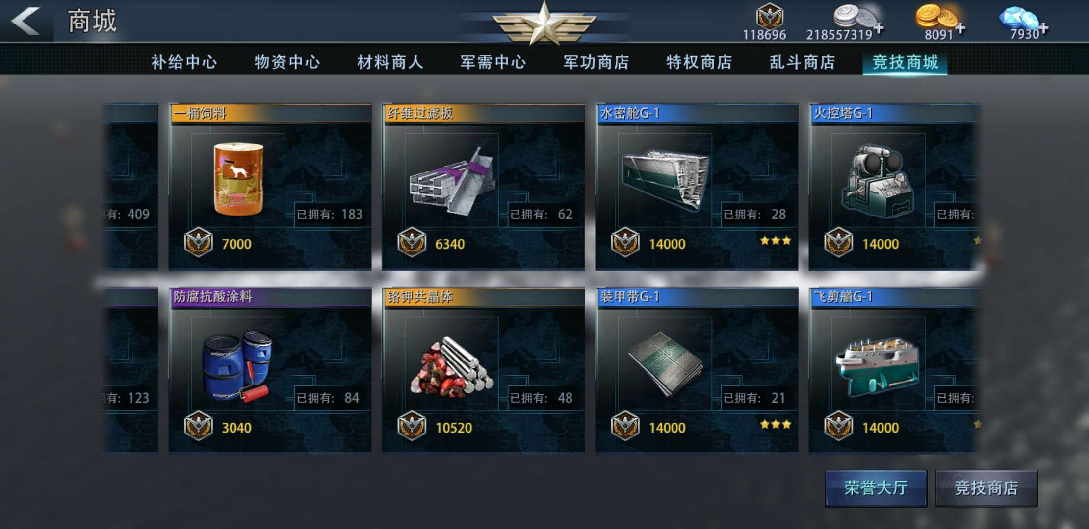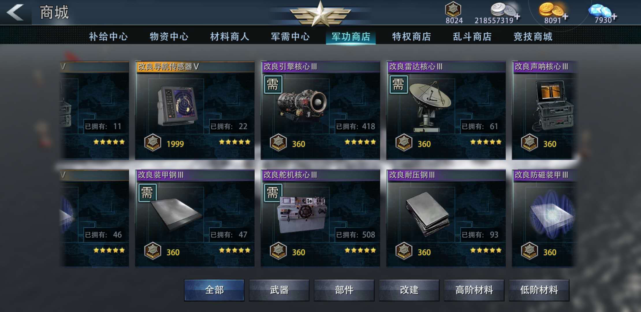 其次,功绩商店,舰队商店,军功商城和竞技商城都有材料可以兑换,具体换哪个性价比最高请大家细心计算了。