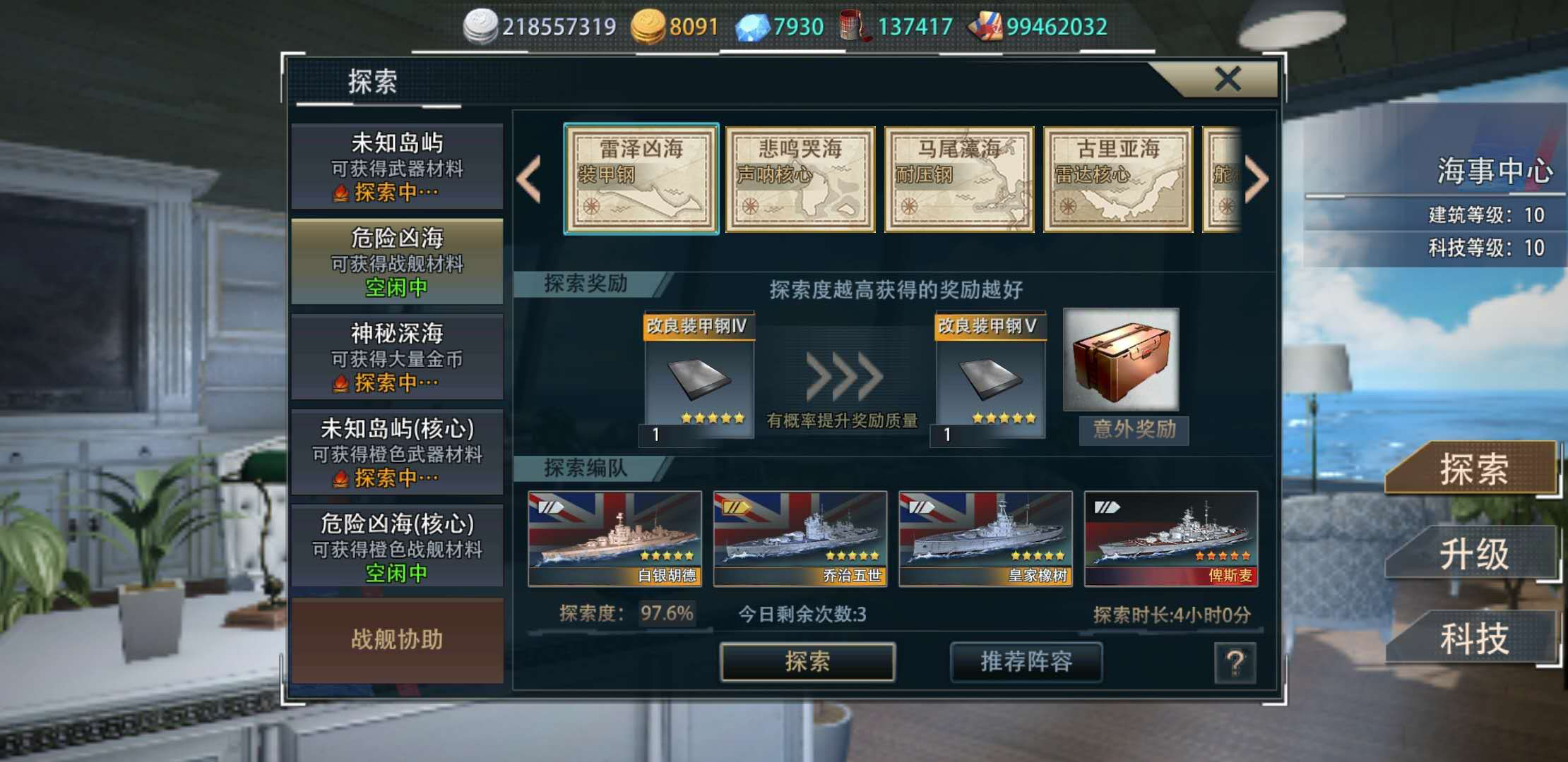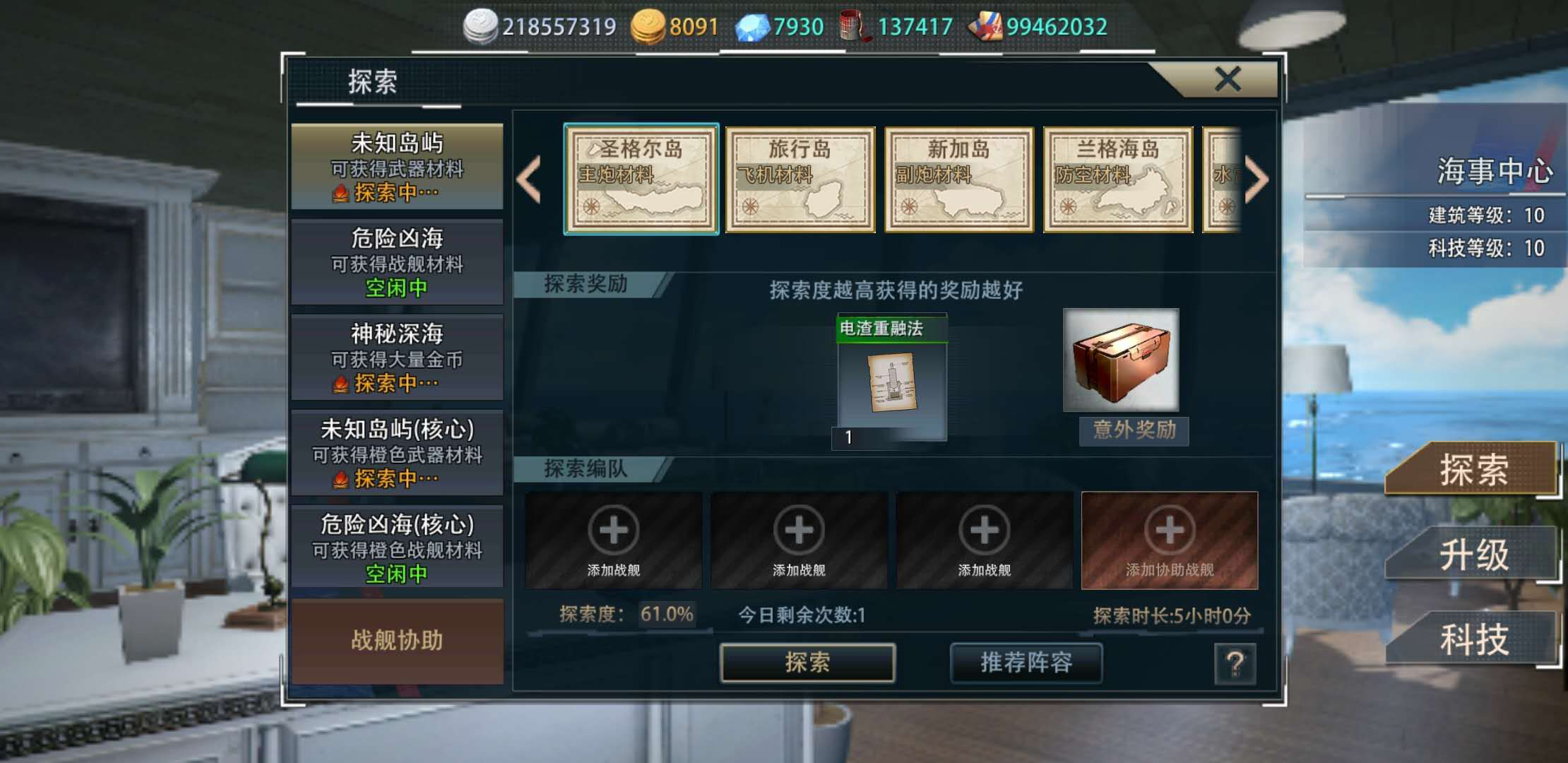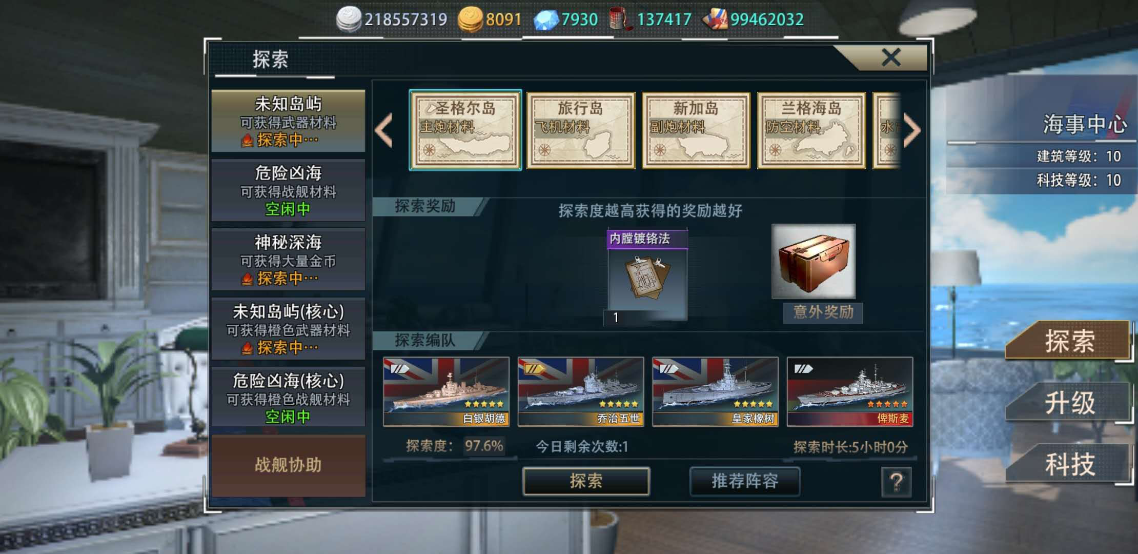 军港里的海事中心可以探索材料,优先推荐五个小时的主炮紫图和四个小时的舰体或雷达材料。