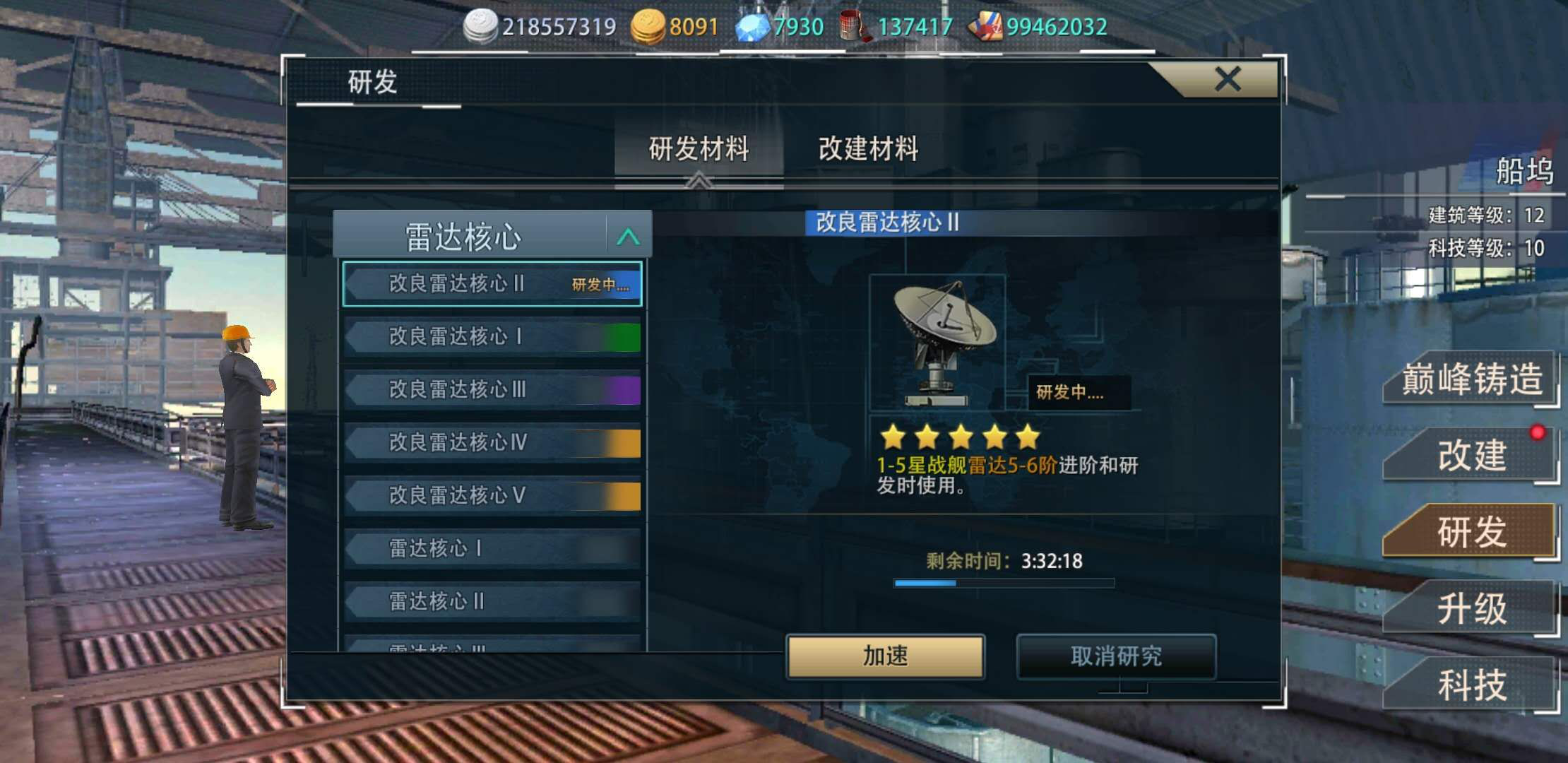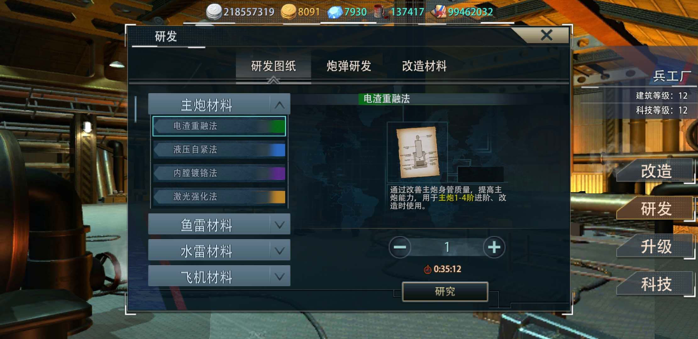 战舰工厂里可以研发材料,有时间的可以研发一小时的最低级材料,如果不能保证一小时收材料但是可以经常上线的就要研发蓝色材料,这样性价比最高。
