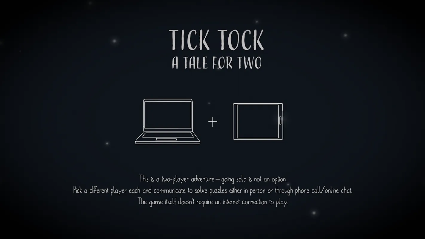 合作是关键独自游玩是行不通的!在这个充满了各种谜题的诡异世界中,挑战将会变得越来越难,解决这些谜题需要充分利用你们的合作技巧。请记住,你们两个缺一不可,你们的沟通能力将助你们成功逃脱。平均游戏耗时:2.5小时叙事冒险进入这个精美的手绘世界,体验一场受北欧童话故事启发的神秘历险。探索怪异村庄里的不同地点:拜访古老的钟表店、调查地板吱呀作响的房间或是闯入黑暗的地下室寻找解开谜题的答案。最终揭开故事背后的秘密。简单的操作,富有挑战的谜题《Tick Tock》操作十分简单,任何人都可以轻易上手加入冒险!你需要的只是一个伙伴,与你交流所见所闻,从而解决谜题并安然无恙地逃离这个世界。跨平台游戏这个游戏允许玩家跨平台游玩,大家可以在Nintendo Switch、PC、Android或者Mac设备上进行游戏!是在两台电脑上游玩,还是躺在沙发上用Switch或平板电脑玩,完全取决于你们自己!故事在《Tick Tock: A Tale for Two》里,你和你的朋友发现自己被困在一个由钟表制作大师阿玛丽·雷文创造出来的怪异世界中。你们的任务是逃离这个世界!为此,你们需要探索这个神秘又阴暗的钟表世界,解决随处可见的秘密和谜题。结合双方玩家屏幕上的信息,才能找到真相并最终逃离这个地方。准备好踏入这个叙事冒险世界吧,在这里你的沟通技巧将受到考验。大声说出指示,与同伴讨论彼此的所见所闻。但请记住:时间在滴答流走。得到丹麦电影协会The Games Scheme支持"