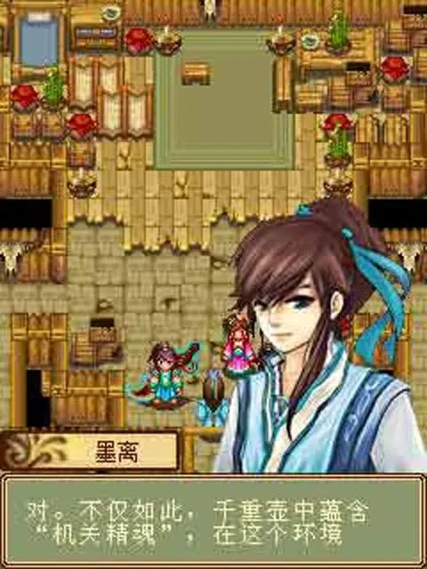 九天系列作品第二部,画面在延续前作基础上,对人物刻画、场景描述以及战斗画面的表现上有了进一步的提高,但毕竟作为手机平台的JAVA游戏表现力有限,虽然足见美工们的用心,仍然无法给人以赏心悦目的感觉。最明显之处在于战斗系统中的破不再是单纯的秒怪,而是掺入了技能光影。在人物对话中,出现的人物特写感觉很不错,人物比例完整,绝对不感觉别扭。剧情 ★