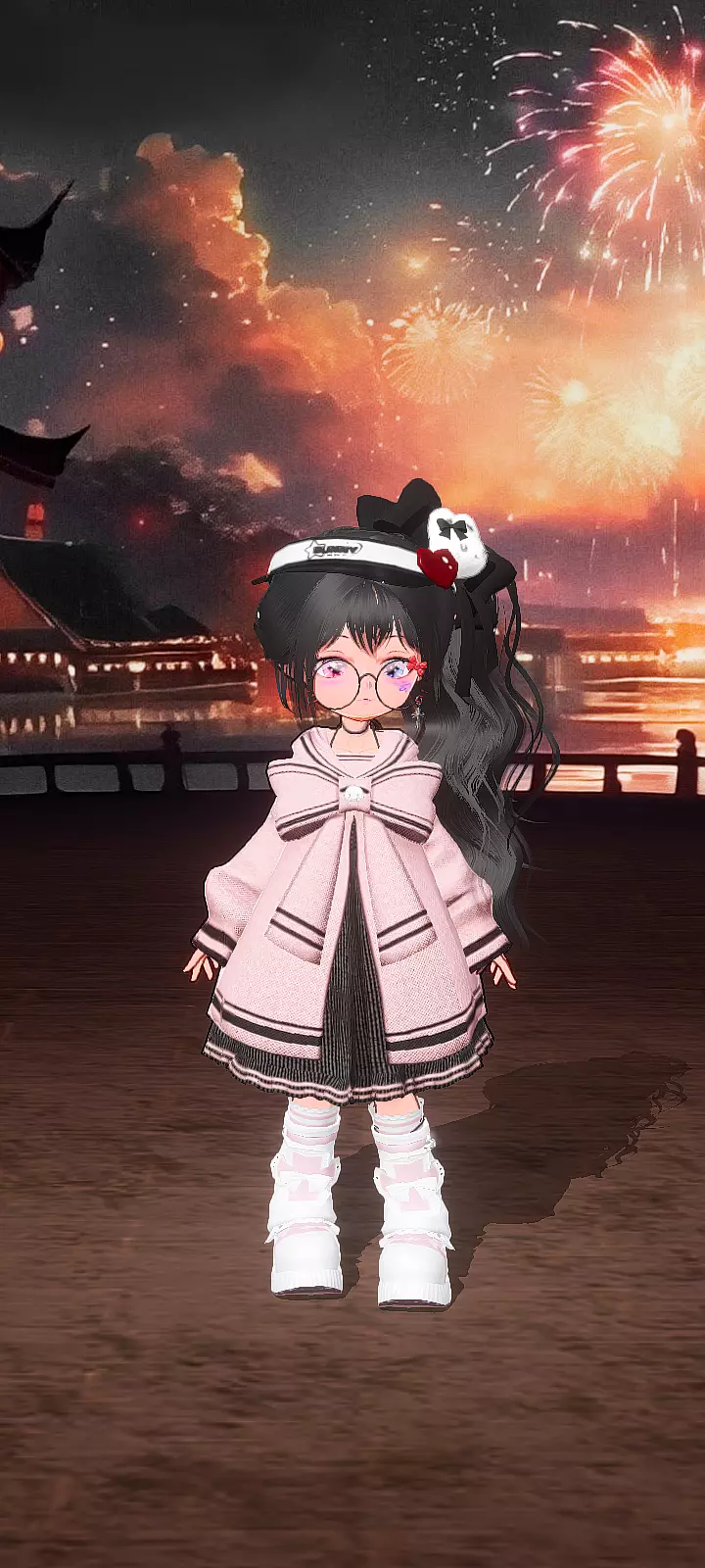 #我理想中的校服 在学社圈搭配了这套粉白蝴蝶结校服,真的太戳我了!暖乎乎的粉外套+百褶裙,搭配同色系袜子和大头鞋,在烟花背景下氛围感直接拉满,这才是青春该有的样…