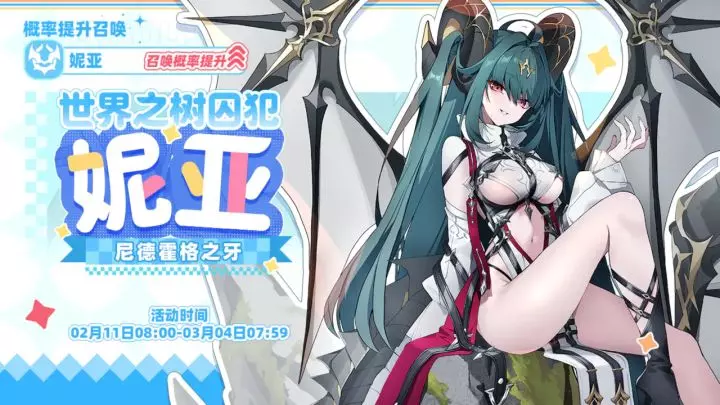 「世界之树囚犯」 概率提升召唤现已开启!恶魔型精灵「妮亚」 召唤概率提升 ! ▶▶召唤开放时间◀◀ 2026/02/11(周三)08:00~2026/03/04…