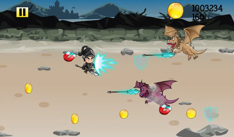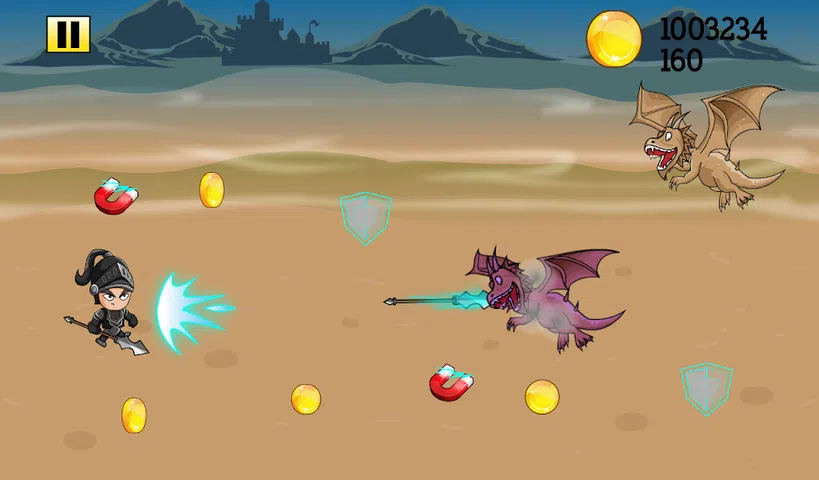 请确保在您收集战利品,您杀戮怪物孵化龙蛋。 每枚硬币计入总! 有两个电源的UPS在游戏领域。 穿过防护罩,它可以保护您免于所有的龙,一个短的时间。 磁体将增加所有硬币进入查看,吸引他们到您的金属铠甲骑士只简略地观看的小龙,他们喜欢黄金!