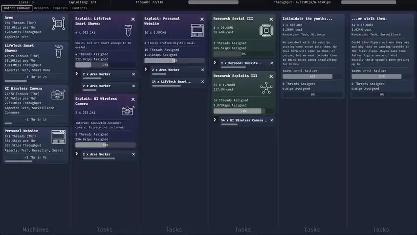 《入侵指令:暗影之网》是一款设定在赛博朋克世界中的挂机类黑客Roguelite游戏,在这个万物互联的时代,玩家将逐步解锁升级,拓展属于自己的傀儡网络,入侵并解锁数百万台设备,优化自己的网络架构,并最终决定人类世界的最终命运。《入侵指令:暗影之网》将让玩家化身为一名指挥官,掌控一张不断扩张感染的计算机之网。玩家通过扩展这张专属的傀儡网络,不断训练战神Ares——一个具备自我进化能力、能够大规模入侵设备的AI化身。主动挂机式玩法根据每项任务的需求,玩家需要合理分配机器,挑选最适合的设备来执行相对应的任务。除此之外还需要优化资源分配策略,确保这张网络始保持持续高速的运转。利用脆弱的设备玩家可通过发现存在漏洞的目标设备,合理使用资源对其进行入侵,从而不断扩展自己的傀儡网络。建议选择最合适的设备进行渗透,以便持续获取更多算力,达到壮大网络规模的目的。研发强效的升级优化玩家在每一轮游戏中解锁各类强力升级,不仅能直接增强Ares的能力,也能为整个傀儡网络带来全局增益效果。入侵反制系统(ICE)小心!ICE(Intrusion Countermeasure Electronics,入侵反制电子系统)将试图阻止玩家的扩张!你必须迅速应对,重构你的傀儡网络,在它彻底冻结一切之前将其击溃!决定人类的未来命运玩家的选择将决定故事的走向。在游戏过程中,你的每一个决策都会塑造不同剧情的展开。通过丰富多变的事件与任务,玩家可自由选择前进的道路,在多次游玩中解锁不同的结局。特点分配机器执行任务,在串行与并行处理能力之间巧妙权衡利用脆弱设备,不断扩展玩家的傀儡网络研发Ares的升级模块,提升核心能力对抗ICE,当入侵被敌方发现时挺身迎战在丰富的事件与任务线中自由抉择,走出玩家的专属路径多周目游玩,解锁多个不同结局