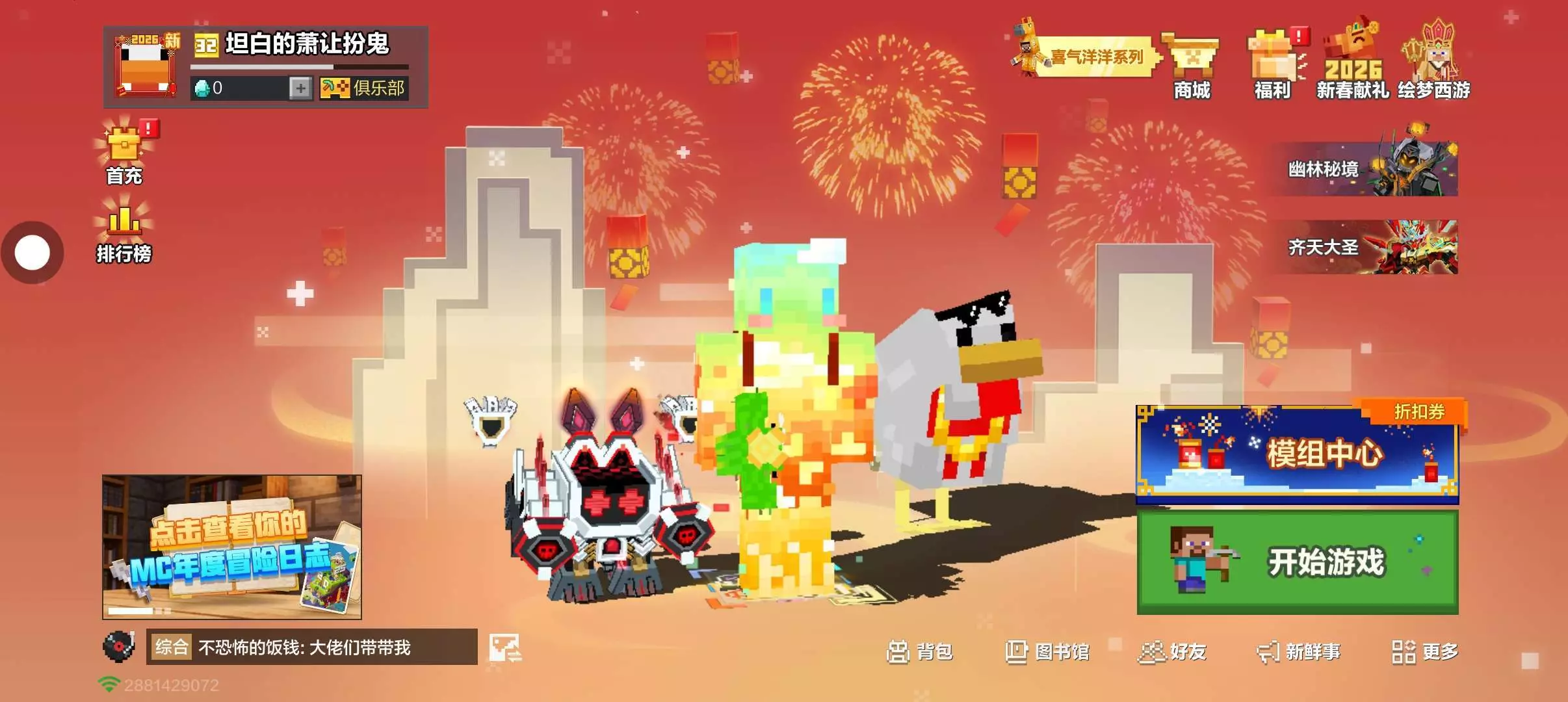 1752.3 万 热度 全新“苍园觉醒”版本现已开启!探索神秘全新群系——苍白之园,发现发光植物与奇异生物。截图功能优化助你一键出片,分享更有每周专属奖励。挑战极限生存模式,体验唯一生命的严峻试炼。全新主题季“绘梦西游”火热开启,神话皮肤再度降临。更有“我的山头”模组专区分类功能上线,模组管理与查找更便捷。冒险家们快开启属于你的全新冒险篇章! 《我的世界》(Minecraft)是一款风靡全球的3D沙盒游戏,由网易游戏代理运营的中国版手游,现在已开放官方正版的免费下载。 凭借自由无限的开放世界、超乎想象的游戏玩法,《我的世界》深受上亿玩家的喜爱。玩家可以独自探索、或与朋友并肩冒险,探索随机生成的世界,创造令人惊叹的奇迹。更有丰富的组件资源,帮助玩家开启多种创意玩法。你想玩的,这里都有。快拉上小伙伴一同加入冒险家大家庭,随时随地享受创造乐趣! 【苍白之园静候探索,神秘群系悄然登场】 《我的世界》“苍园觉醒”全新版本重磅更新!静谧而神秘的土地布满奇异的苍白植被,点点萤光自地面升起,嘎枝在林间悄然靠近。全新生物与植物等待冒险家发现,更有隐藏遗迹与稀有资源深藏其中。漫步在这片宁静而魔幻的森林,每一步都可能遇见意想不到的惊喜。 【截图分享功能焕新升级,记录精彩一键直达】 截图分享功能现已全面优化。新增一键隐藏HUD界面功能,助力冒险家们轻松捕捉无干扰的纯净画面,无论是壮丽景观还是精巧建筑都能一键出片!完成分享后更可解锁每周专属奖励,冒险家们千万不要错过。现在就用全新截图功能,记录并分享在方块世界的每一个高光时刻吧! 【极限模式挑战降临,生存试炼正式开启】 我的世界极限模式现已震撼上线!仅有一次的生命,困难难度锁定,且无法更改游戏模式。每一刻的生存都将是真正的试炼,每一次决策都关乎存亡。唯有最坚韧的冒险家,才能在这严苛的法则下构筑属于自己的传奇。冒险家们,敢接受挑战吗? 【“绘梦西游”主题季来袭,神话皮肤重塑传奇】 “绘梦西游”主题季盛大启航!融合传统神韵与方块美学,结合科幻色彩的特效,孙悟空、杨戬两位经典角色将以全新神话外观强势降临方块世界。参与全新主题季活动,收集专属道具,体验剧情任务,在方块世界中亲历斩妖除魔、西行取经的浩瀚传奇。这一段如梦似幻的神话之旅,等你来书写新章! 【炼狱牛魔王威临,霸气皮肤炽焰登场】 炼狱裂隙重开,牛魔王携烈焰重铠踏火而至!全新皮肤“炼狱牛魔王”正式降临,周身环绕不灭狱火,巨斧缠绕熔岩纹路,每一次踏步皆引地动山摇。其盔甲由深渊玄铁铸就,肩甲呈怒角冲天之势,眼中燃烧着永恒的战意。化身炼狱主宰,以最霸道的姿态征服每一片大陆。 【“我的山头”模组专区分类功能上线,分类检索便捷直达】 “我的山头”模组专区全新升级,现已支持分类检索功能。模组按玩法、类型、热度等维度清晰归类,冒险家可轻松筛选并找到不同风格的模组集合。界面浏览更直观,搜索筛选更精准,寻找心仪模组从未如此简单。体验更便捷的模组之旅,尽在“我的山头”全新模组分类专区!