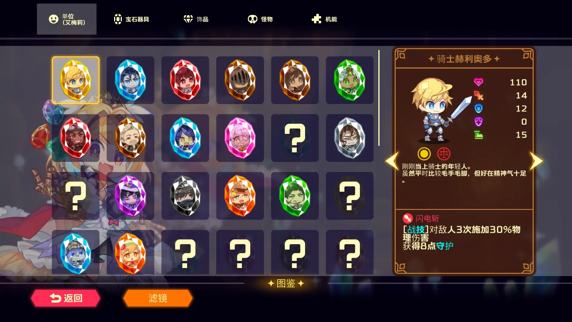 朝着地牢最底层进发!在随着游戏进行不断变化的地牢中探险,打倒守在最底层的黑魔女,将被变成宝石的伙伴们解放出来吧!将宝石(单位)收集起来吧!将散落在地牢内的宝石(单位)收集起来拉入同伙吧。集结相同的宝石便可以发挥更强大的力量!构建属于您的独特骑士团!将单位编入队伍即可发动“印记能力”。若集结了“颜色”或“符号”相同的单位,便能根据其组合方式发动形形色色的效果。尝试构建属于您的独特骑士团吧!使用宝石器具支援战斗!玩家可以使用蕴藏于宝石中的魔法或道具来支援战斗。运用精准的判断力击败地牢中潜藏的敌人吧!琳琅满目的饰品在地牢中偶尔可以获得饰品。饰品拥有着各种各样的效果。您可以佩戴饰品让您的队伍如虎添翼。根据您的队伍配置佩戴合适的饰品,牢牢掌控优势战局吧!