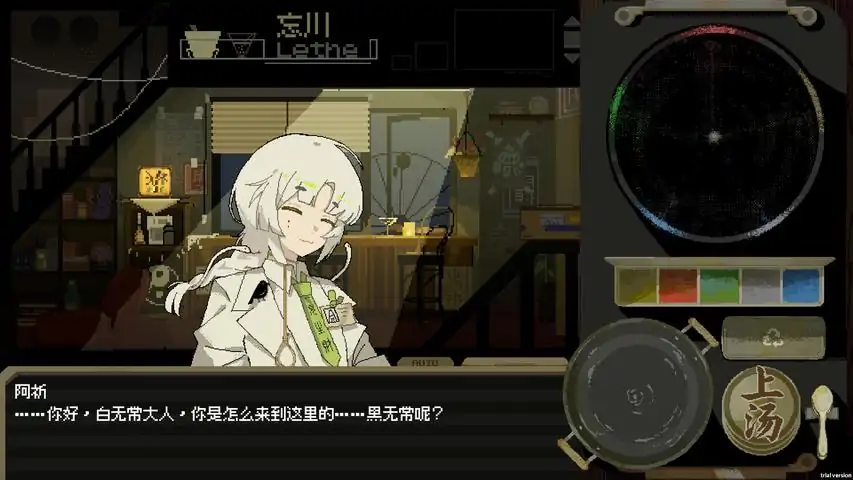故事背景:欢迎来到忘川镇。忘川镇,地府的边陲小镇,也是灵魂转生的最后一站。你将扮演阿祈——一位拥有共感天赋、刚从天庭裸辞返乡的少女。你被迫接手来了奶奶留下来的老字号“忘川亭”,成为了光荣的新任孟婆。“什么,奶奶收留了奇怪的人?”在忘川亭里,你将与住在地下室的神秘黑客,以及住在阁楼里的神秘少年小孟相处,并与他们一起,面对脱线又欢乐的忘川镇日常。降本增效的风还是吹到了忘川镇,面对自动化转生流程,忘川镇该怎么度过这次难关呢?“阎王大人,所以我们为什么要办这个?”“这可是我想出来的,面对检查的终极解决办法!”玩法:做一名灵魂调汤师忘川亭不卖酒,只卖孟婆汤。作为孟婆,你拥有家族遗传的共感天赋,能看到客人情绪的流动。五味杂陈的人生: 使用情绪罗盘,分辨灵魂此刻的状态。根据客人的需求(或你的恶趣味),调配出专属的汤药。小心炸锅: 如果你把互斥的情绪乱炖在一起,可能会遭到客人的吐槽 。奇怪的孟婆汤?支线玩法:邀约你感兴趣的灵魂,和他们在忘川镇的奇景中共度时光。