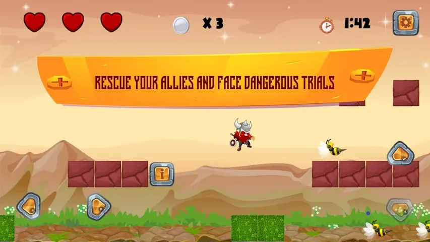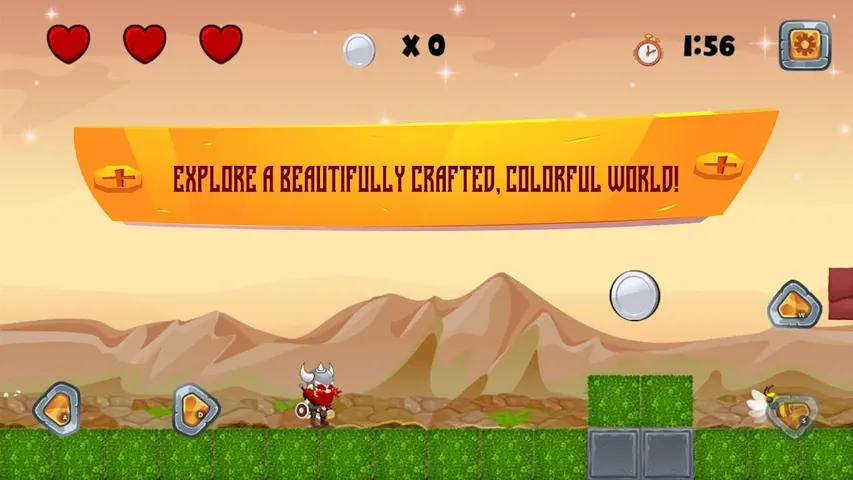 加入我们的维京英雄,踏上充满障碍和奖励的激动人心的冒险!控制:向右移动:要向前移动,点击向右的箭头。- 向左移动:向后移动,点击向左的箭头。- 跳跃:点击向上的箭头,使维京人跳过障碍或击败对手。- 点击并按住:按住箭头继续朝那个方向移动。要小心,因为它们可能是有害的! - 红心:从三颗心开始,每颗心代表一条生命。如果你失去了所有的心,你必须从头开始关卡。你有三次机会完成每个关卡。- "!"用“!”头撞方块- 终点线:要赢得每个关卡,请在限定时间内冲过终点线并获得奖杯。完成关卡将导致下一个挑战。提示:-快速移动,并留意路上的障碍和对手。-随着你的继续,困难会变得更加困难,但凭借技巧和耐心,你将克服所有困难!祝你好运,享受你的冒险!