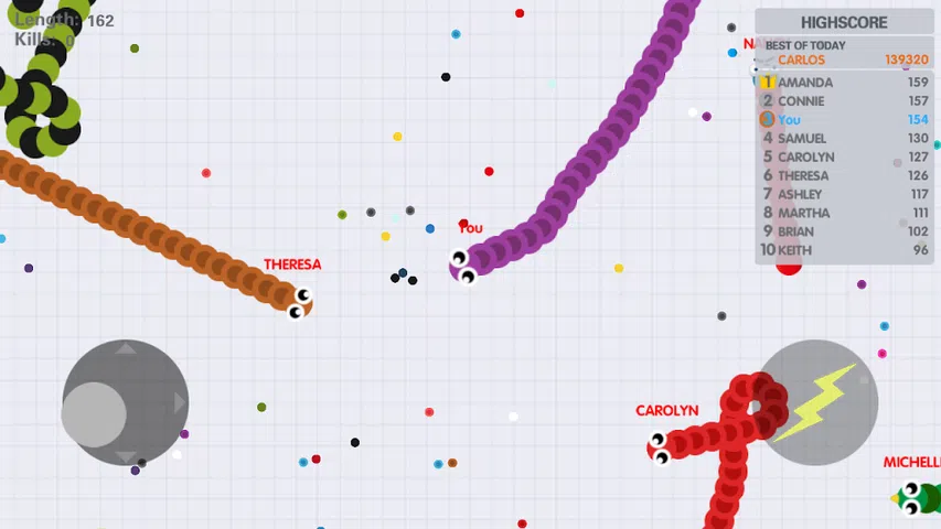 蛇之战尝试让敌人跑到你的尾巴上杀死他们。所以你可以杀死一条比你大的蛇。 《贪吃蛇》的新功能允许玩家一起在线玩游戏或与人工智能(离线)对战,这使得视频游戏特别有吸引力和乐趣! 怎么玩 : ◆ 控制蛇避免撞到其他蛇。 ◆ 使用速度按钮(火箭形状,位于屏幕右下角)可以跑得更快。注意,当快速奔跑时,蛇的长度会缩短。 游戏特色: ★ 无延迟。在任何设备上都没有性能问题。 ★ 在离线或时间模式下,在单人游戏中与人工智能进行离线游戏。 ★ 完全优化的游戏玩法,使用屏幕操纵杆来控制滑行的蛇。 ★ 战略阿尔法时间游戏模式。 ★ 简单易学、直观的触摸屏控制。 ★ 免费玩。 ★ 高清晰度图形。 现在下载!最佳 MMO 滑行游戏 如果您在安装中遇到任何问题,请向我们报告。我们会尽快修复它