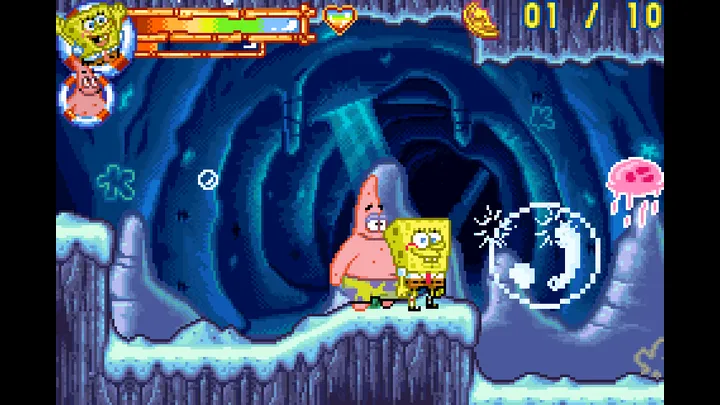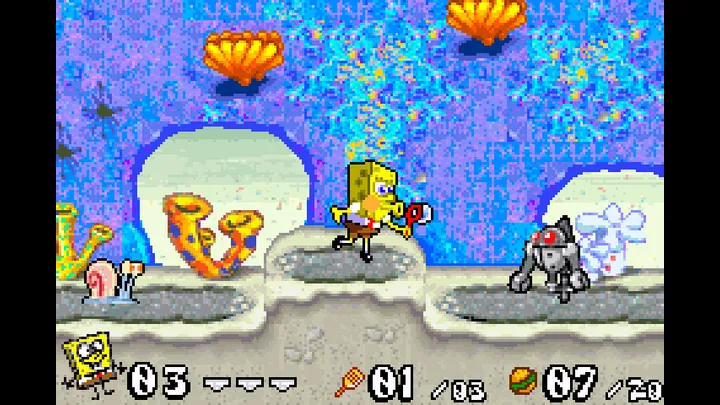 GBA(Nintendo Game Boy Advance,任天堂Game Boy Advance)平台《海绵宝宝 比奇堡的冒险》(英语原名:SpongeBob SquarePants: Battle for Bikini Bottom;汉化译名:海绵宝宝 比奇堡的冒险),由Vicarious Visions开发、THQ发行,于2003年10月31日首发,是一款基于同名动画改编的2D平台冒险游戏。