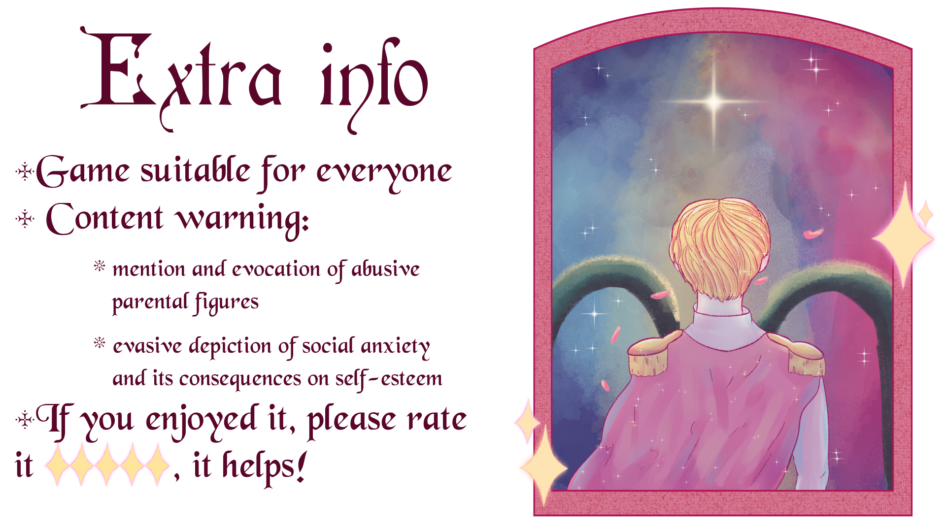 《窗户之外(Outside the Window)》是一款简单的堆像素房子游戏,你需要一块一块的建立起自己的像素城景,之后,静静欣赏自己的成果来放松心情。游戏内仅含禅模式与地狱模式。游戏玩法玩家可以通过选择砖块组来随机决定后续5个砖块的类型,每叠完一个层级,可以继续叠下一层级,当当前页面的砖块全部用完后,可以继续解锁下一个区块。在禅模式下,不需要达到积分也可以继续进行游戏。 在地狱模式下,不同砖块类别的相互接触会产生不同的积分,在标准模式下,需要积累到一定的积分才能抵达下一个层级。关于开发者我是Liujiajun,这款依然有点微妙的游戏是我第四部上Steam的作品,感谢你的游玩,如果在游玩过程中有任何问题或者建议,欢迎与我联系。