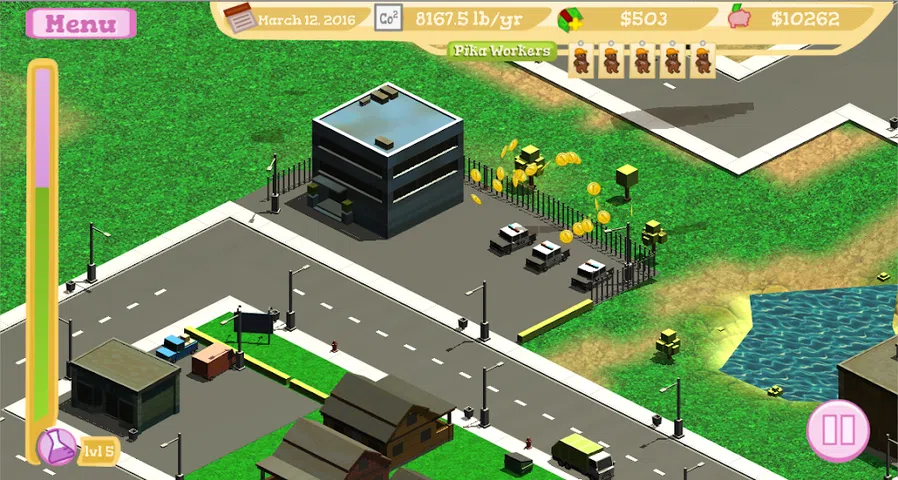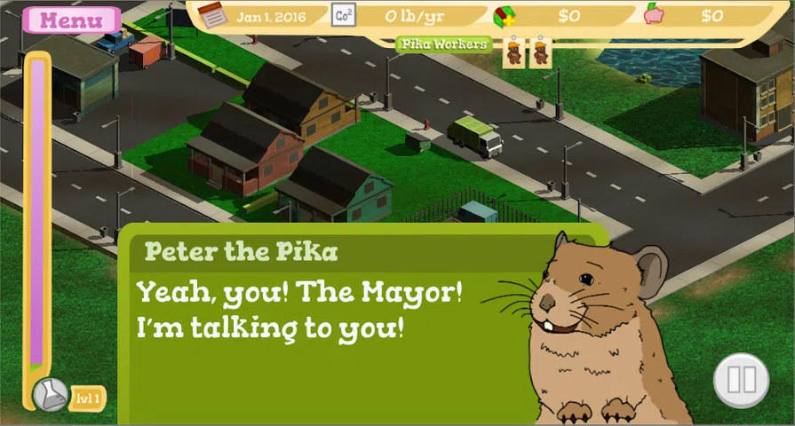 Save the Pikas 是一款城市建设/管理游戏,玩家的任务是使用可用资金购买建筑物和车辆的升级,最终减少二氧化碳排放以缓解气候变化。玩家必须通过对城镇的建筑物和车辆进行各种升级来拯救鼠兔(充当玩家助手的可爱小动物)。每次升级都有自己的碳强度、节电(均基于实数)、成本和安装时间的平衡。