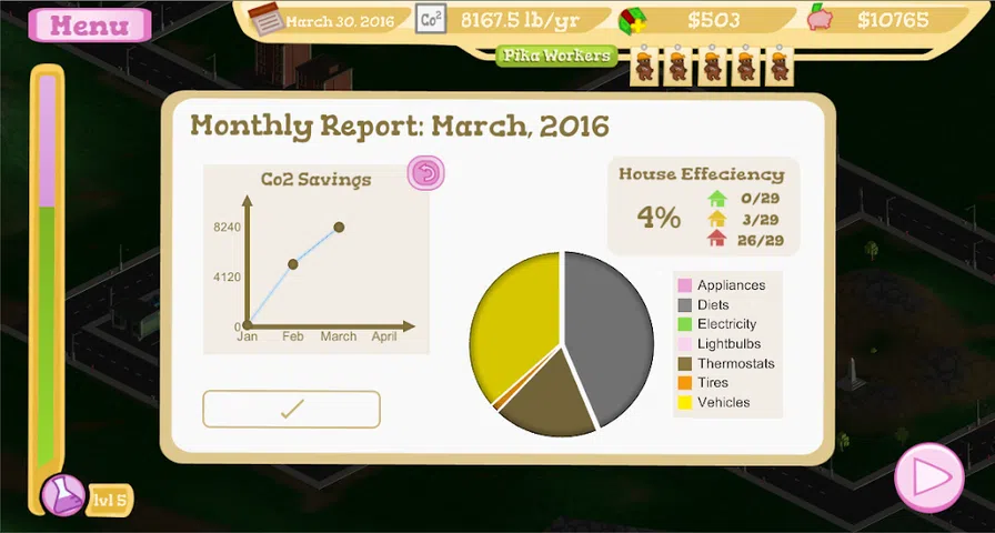 Save the Pikas 通过对建筑物、汽车和生活方式进行节能升级,解决了减缓气候变化的战略。它通过游戏的各种元素迫使玩家考虑他们的每项活动产生的碳量,并教导如何最大限度地减少个人的碳足迹。作为游戏的一部分,玩家通过在虚构城市的管理中做出有气候意识的决策来“节省”多少二氧化碳(即不再释放到大气中),并且必须尽可能多地节省二氧化碳。向玩家展示,从长远来看,做出有碳意识的决定可能具有成本效益,从而减少他们的电费(这是玩家赚钱的方式)