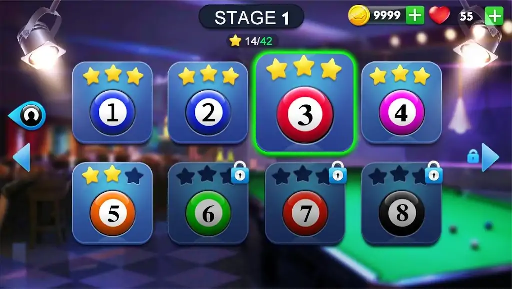 玩法融合策略与操作深度:通过 B 键显示球号,按住 B 键 + 方向键可微调击球触点,实现旋转球、缩杆等花式技巧。模式涵盖 8 球、9 球等规则,支持双人对战与单人锦标赛,过关后需通过蓝色 / 红色球台考球晋级,考验进阶技巧。