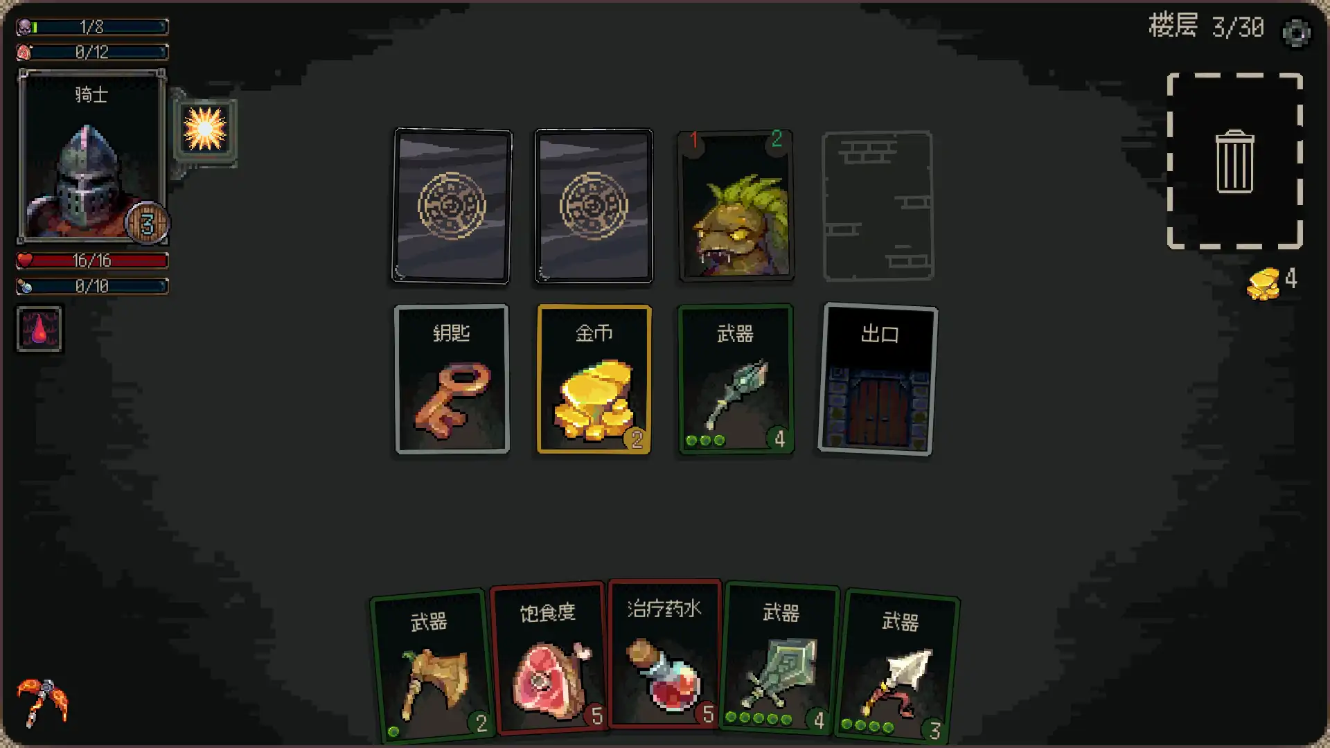1417 热度 《地牢突袭》是一款冒险卡牌Roguelike游戏。逐层深入地牢,击败敌人并挑战最终BOSS。祝你好运!切记不要死于饥饿…… 特色玩法 - 独特的进度系统:找到通往下一层的门,用钥匙继续前进。但要小心!一个错误的决定可能会导致死亡。选择下一张卡牌,让你离胜利更近一步! - 基于直觉的Roguelike:每回合都要做决定。找到有用的卡牌,结合宝箱中找到的物品和商店购买的物品来增强角色。但要小心陷阱和危险的敌人! - 总有再来一次的机会:你永远不会觉得在地牢深处完全准备好了。游戏是为了反复挑战而设计的。每次新的游戏都是独一无二的,即使是经验最丰富的玩家也会觉得新鲜。利用你的直觉和角色的独特能力,抵御潜藏在地下的危险生物。 - 完全兼容所有游戏手柄,包括Steam Deck。 - 时尚的2D像素艺术风格。 游戏中你能体验到的部分内容如下 - 6名可解锁的英雄:每个英雄都有独特的被动能力和法术,让你在每次游戏中都能改变游戏风格。 - 大量色彩绚丽且细节丰富的卡牌和物品可供解锁。 - 超过10个的独特BOSS,每个都需要特殊的战术才能击败。 - 如果游戏难度过高,你可以使用卡牌升级来让游戏体验更轻松。