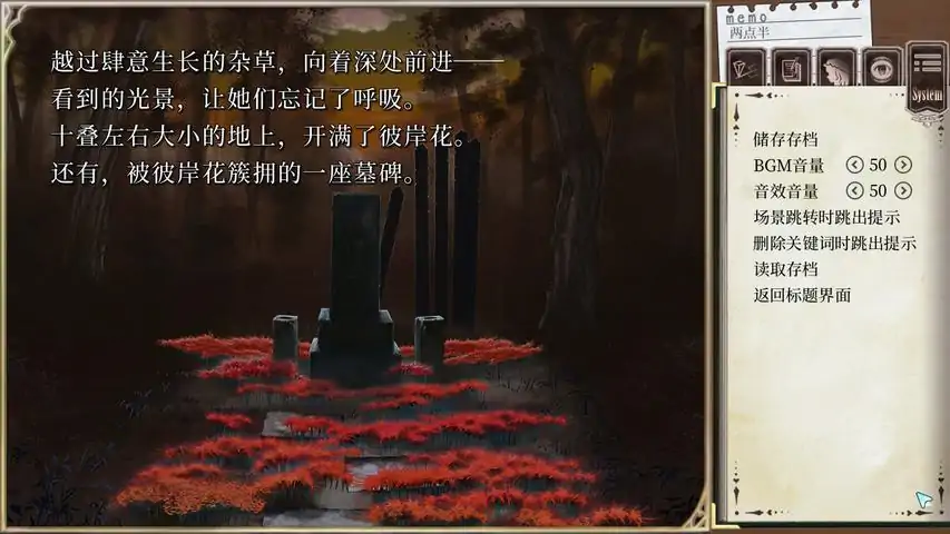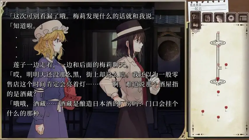 ——时为科学世纪。用53分钟就能从首都京都到达东京的全地下新干线『广重』也已经通车。玛艾露贝莉・赫恩。宇佐见莲子。两人现在——还尚未相遇。~游戏概要~这是一款以解谜为主的二次创作文字冒险游戏。以上海爱丽丝幻乐团的「秘封俱乐部」系列作为题材。故事发生在秘封俱乐部的第一部作品《莲台野夜行~Ghostly Field Club》之前。游戏开始于大学的入学仪式之后,梅莉和莲子相遇的那一刻。使用从两人对话中获得的记忆「碎片」中导出的词汇最终完成『莲台野夜行』的故事,是这个游戏的目标。~记忆「碎片」~「碎片」系统灵感来源自「合资会社自行车创业」的「ANOS系统」比起以前的文字冒险游戏,该系统带来了全新的游戏体验。从故事中获得的文章「碎片」中自由选择词语生成推动故事前进的「关键词」。如果在剧情节点设定相应关键词,就会走上分支路线。可以看到新的剧情。因为并不能像以前的冒险游戏那样,单纯尝试每一个选项,所以,只是漫不经心地阅读文章是无法通关本作的。命运有「不同路径」,人生却没有「选项」——秘封俱乐部的两人,能打开莲台野的入口吗……关于游戏过程中容易遇到困难的部分,我们制作了比游戏中的线索更循序渐进的“分阶段提示攻略”。如果能作为游戏过程中的参考就太好了。※对于想要无提示通关的人来说这是多余的帮助,请注意不要阅览。