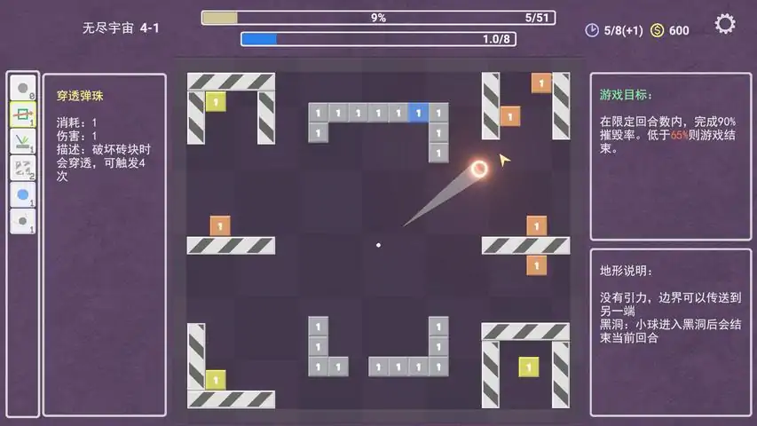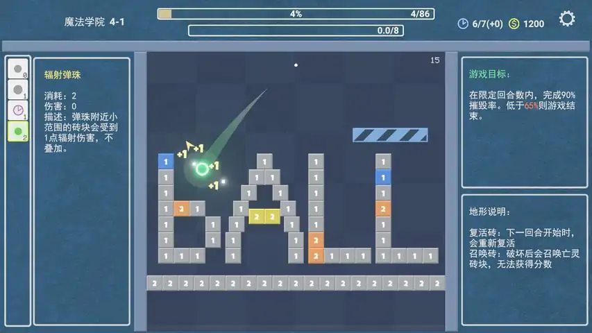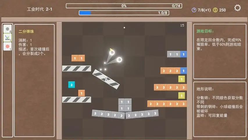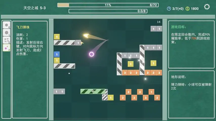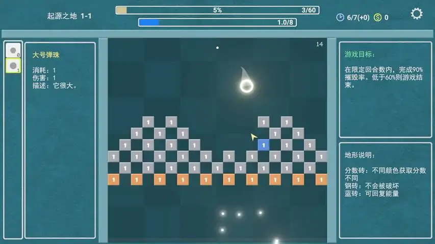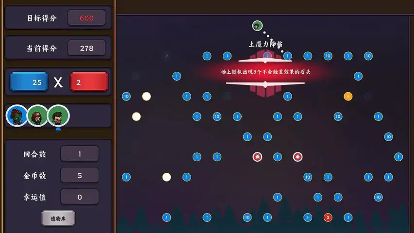 玩法介绍:疯狂弹珠是一款结合弹珠碰撞和卡牌构筑玩法的游戏。游戏内有弹珠、放置物和遗物三种物品。放置物会随机生成,并且会随机带有不一样的特殊效果。你需要发射弹珠碰撞放置物获得积分,获取遗物提升弹珠和放置物效果,最终达到指定积分通关。游戏中会给一些放置物进行附魔,一共有三种附魔效果。易碎:一次撞击将放置物破坏,获得大量奖励加成:前 X 次撞击获得加成保护:前 X 次撞击放置物无效果,破坏附魔后获得大量奖励游戏中会随机触发魔法降临效果。木:随机X个放置物附魔保护效果水:随机X个放置物不停变换位置火:摧毁场上X个放置物土:场上随机出现X个不会触发效果的石头