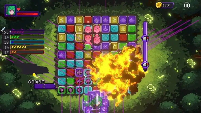 每首电子曲目即为一局战斗(2分钟),按节拍消除金木水火土元素棋子,触发弹幕攻击下行怪物。连消激活角色大招(如「万磁飞砖」「圣光回血」「骑兵冲锋」)。 花式弹幕:镭射、炸弹、音波、勇者大剑等子弹产生独特特效,组合形成新攻击方式,伴随音乐绽放华丽光效。‍♂️ 策略深度·自由构筑/五行相生相克:金系护甲反伤、木系毒育召唤、水系穿透控场…组合道具打造专属流派强化。⚡️ 动态战场改造:隆起岩柱抵挡路径,制造集火区;召唤单位卡位,复刻塔防精髓。 声光盛宴·沉浸律动/原创电子曲库:每关专属BGM同步怪物移动鼓点——完美连击提升攻击力,失误中断连击! 霓虹像素美学:赛博棋盘+粒子特效,弹幕碰撞如烟花绽放,体验迪斯科舞厅视效。 肉鸽惊喜·常玩常新 每局结束三选一强化: 特别子弹(镭射/炸弹/音波) 专精核心元素(如强化水系穿透) 解锁跨系共鸣(如木+火=引爆毒雾) 逆风技能(护甲转换全场AOE)
