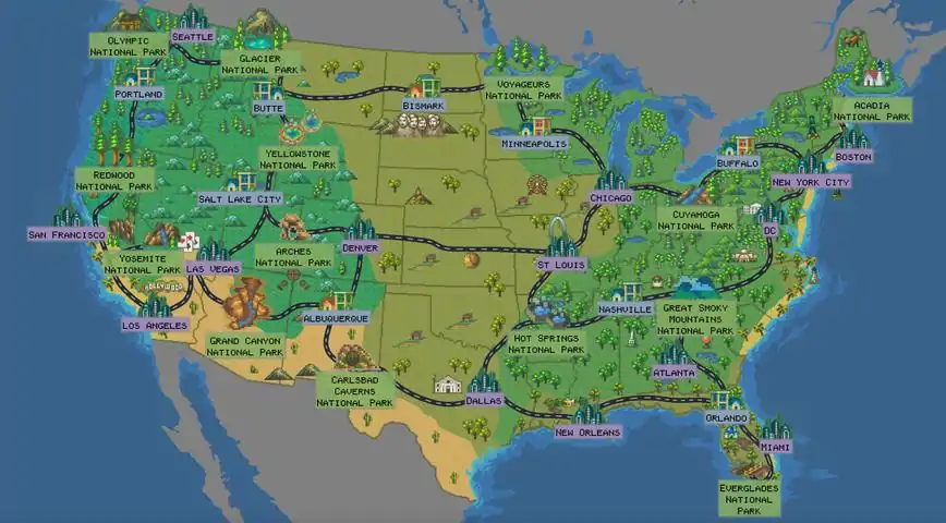 The Van Game is a retro style road-trip around the USA, inspired by the classic "Oregon Trail". Discover over a dozen national parks the way they're meant to be seen, in glorious pixel-art! Dozens of Choose-Your-Own-Adventure encounters with police, Crazy Karens, and fellow travelers. Play 7 different mini-games and manage your resources to stay on the road. Contract over 12 diseases and try to keep your crew happy!Key features:14 beautiful national parks to explore12 fun-filled illnesses including everyones favorite, dysentery!7 challenging mini-gamesManage your money, food, gas and moreKeep your crew happy or they might just abandon the van lifeUpgrade and customize your van, your home away from homeCollect stamps in your park passport and maybe even learn a little