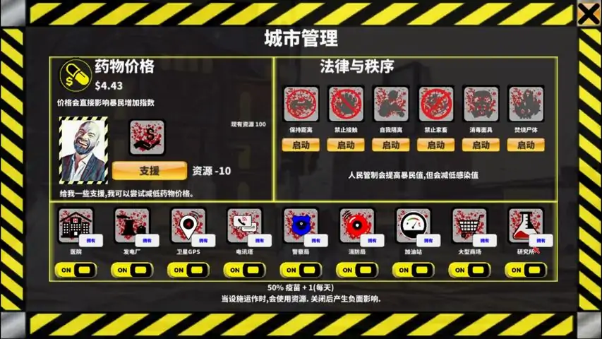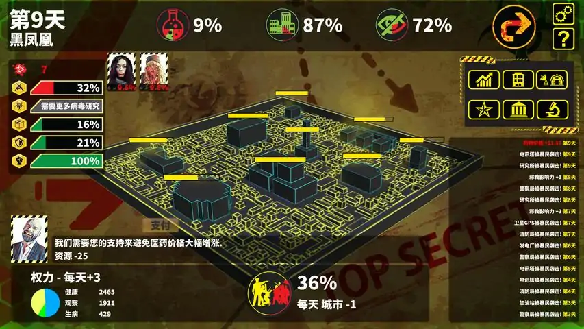 40天是一个特别的策略模拟游戏,背景设立在一个神秘传染疾病开始扩散的城市。你被委任为紧急隔离部门总负责人,政府也答应给你所有的权限和人力来阻止疾病传开到其他城市。与此同时,你要应付各式各样的人和事件和病毒,当然最重要的是要尽快找到可以拯救这个城市的解药。主要任务40天内完成疫苗研究作出明智的决定游戏特点做出相关的行动,例如要求空投,援军,检查人民,研究感染者或其他研究病毒并面对病毒的变异维持市场上的药物价格与药物生意人交易压制邪教徒管理你的城市管理你的病毒研究在关键时刻做出你的决定在随机突发事件上做出你的决定面对义警的威胁防卫来自暴民的攻击保护你的设备提升你的基地