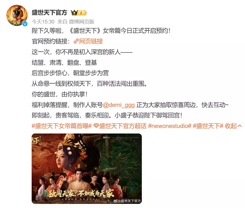 《盛世天下》「女帝篇」现已开启预约!分享预约截图赢乐币会员!