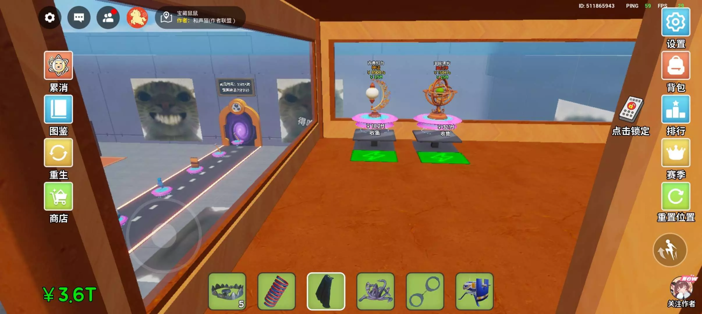 49 万 热度 欢迎来到《宝藏鼠鼠》,在这里体验全新的”搜打撤“ 你可以购买珍贵的 藏品 来为你产生金钱, 可以偷取其他玩家基地里的 藏品, 可以将你的基地大门定期上锁,以防有别人来偷走你的 藏品, 可以购买攻击武器和道具来防守其他玩家! 无论在哪都能随时开启欢乐冒险,收集藏品成为最强鼠鼠吧 ! 喜欢的话就关注猫猫吧!