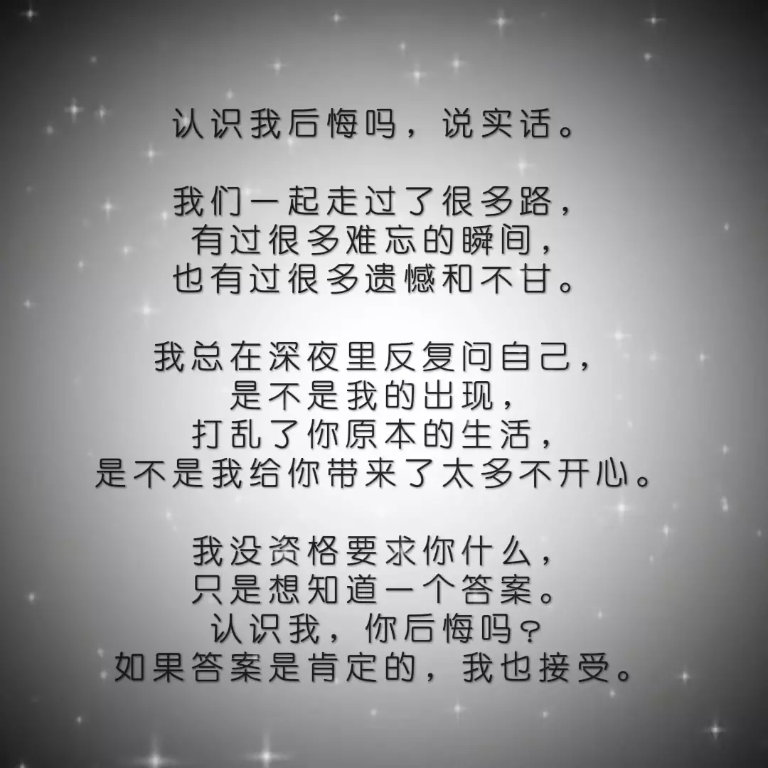 @认识我后悔吗,说实话。 我们一起走过了很多路,有过很多难忘的瞬间,也有过很多遗憾和不甘。 我总在深夜里反复问自己,是不是我的出现,打乱了你原本的生活,是不是我…