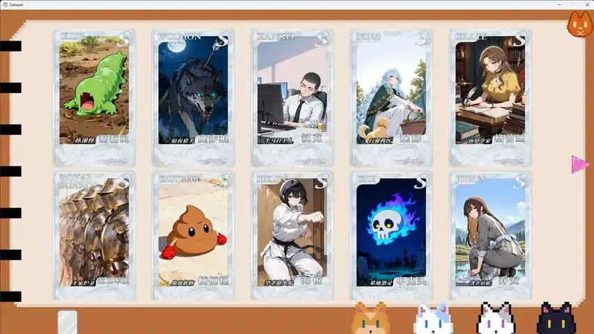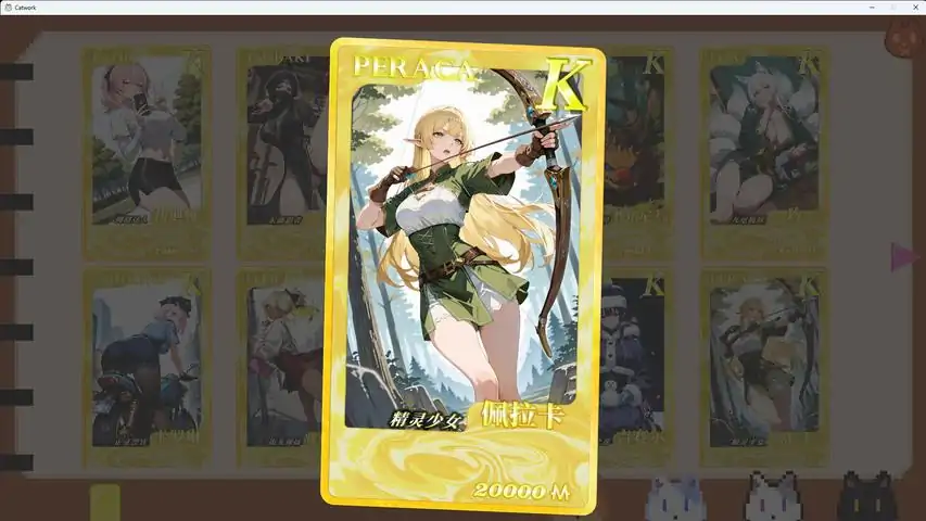 此游戏为休闲挂机游戏玩家在游戏内给猫猫选择工作内容通过等待时间或离线挂机获得收益,获得的收益可在游戏内购买道具以及进行抽奖和抽卡抽卡有三种品质选择,玩家可收集这三种品质卡牌并在相册中查看非常适合上班期间打发时间