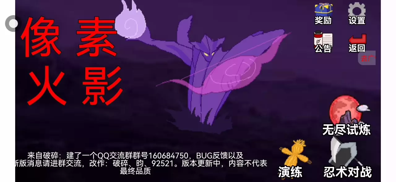 131.1 万 热度 《像素火影改版》采用2D像素格斗形式,呈现火影忍者的经典场景和角色,带来体验原滋原味的火影对决。 这次更新增加部分忍者改动,具体可以进游戏体验(头像有变化的基本有改过或微小的改动,除了长门和暗部)。 根据当时很多人觉得闪退的问题,UP主已经减少部分文件的大小为kb解决,若依旧闪退,下一步将在不干扰游玩的情况下优化包体大小。额外想要音乐体验的可以下载完整版体验。 温馨提示:由于游戏开发引擎原因,手机配置过低会导致游戏闪退,暂时无法解决,非常抱歉。 本游戏是由B站UP主虚幻幽灵QwQ改版制作的同人游戏,原作者为U鼬神及团队,233乐园对该游戏进行收录供大家游玩体验。下载使用产生的版权问题请自行负责,233乐园不承担任何法律责任,如果您喜欢该游戏请支持官方正版。233乐园不拥有任何权利,其版权归该游戏的合法拥有者。如果该游戏侵犯了您的版权,请将相关版权证明或授权证明发送到邮箱,我们将在24小时内删除该游戏。
