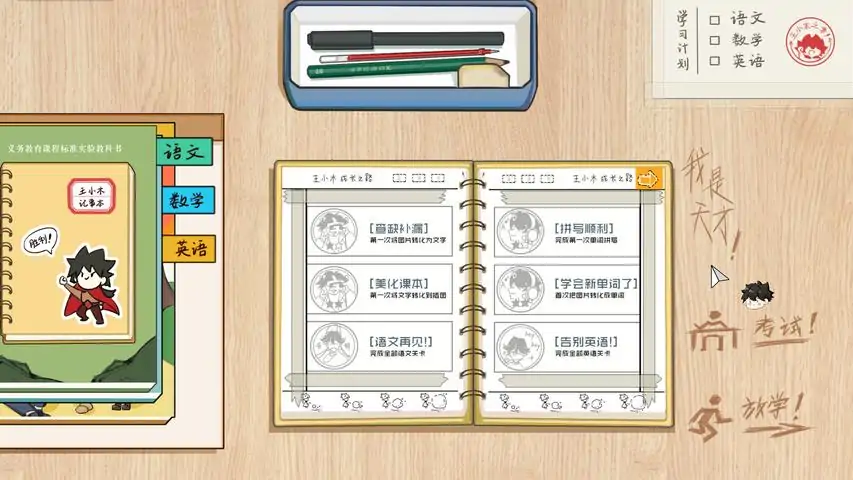 玩家交流QQ群:1058897724,欢迎进群交流反馈!bilibili、小红书、小黑盒官方账号:神游课本欢迎持续关注!《神游课本》是一款以童年课本为背景的休闲点击解谜游戏,你将重返课桌,在语文、数学、英语三门课本中探索知识,破解谜题,体验别样的学习乐趣。1. 重读童年课本在游戏中,你将化身中学生,穿梭于熟悉的教科书页间,感受儿时课本带来的回忆和想象。2. 不再“讨厌”的语数英!每门学科关卡都有独特玩法:在语文书里,你将诵读诗词,观察插画,补全空缺诗意,品味诗词意境。在数学书里,你将把函数作为轨道,引导小球抵达终点,发现函数之美。在英语书里,你将通过拆分和重组单词,创造新物品,体验拼字趣味。3. 怀旧氛围与温馨故事游戏采用插画和成就日记的碎片叙事,记录你在课本世界的每一次发现以及主人公“小木”的童年趣事。无论是小朋友还是怀念童年的你,都能在这本“可以玩的书”中收获乐趣与温暖回忆。