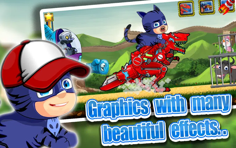 在美好的一天,可怜的动物被邪恶的外星人抓住了,但是有一个超级儿童面具帮助动物,他想从机器人外星人手中拯救所有这些动物。你会帮助他吗? 特征 : 具有许多精美效果的 2D 图形 2 个世界:沙漠和乡村土地 通过触摸和滑动屏幕轻松控制 2 个大朋友:Super Dinobot 和 Super Pumabot 将帮助我们的 Pj Masks 消防员与敌人作战 喷气背包系统 商店系统:购买物品、衣服、生活和应用内购买 (IAP) 用于购买星星。 脸书邀请好友 轻松自定义新敌人、动物。