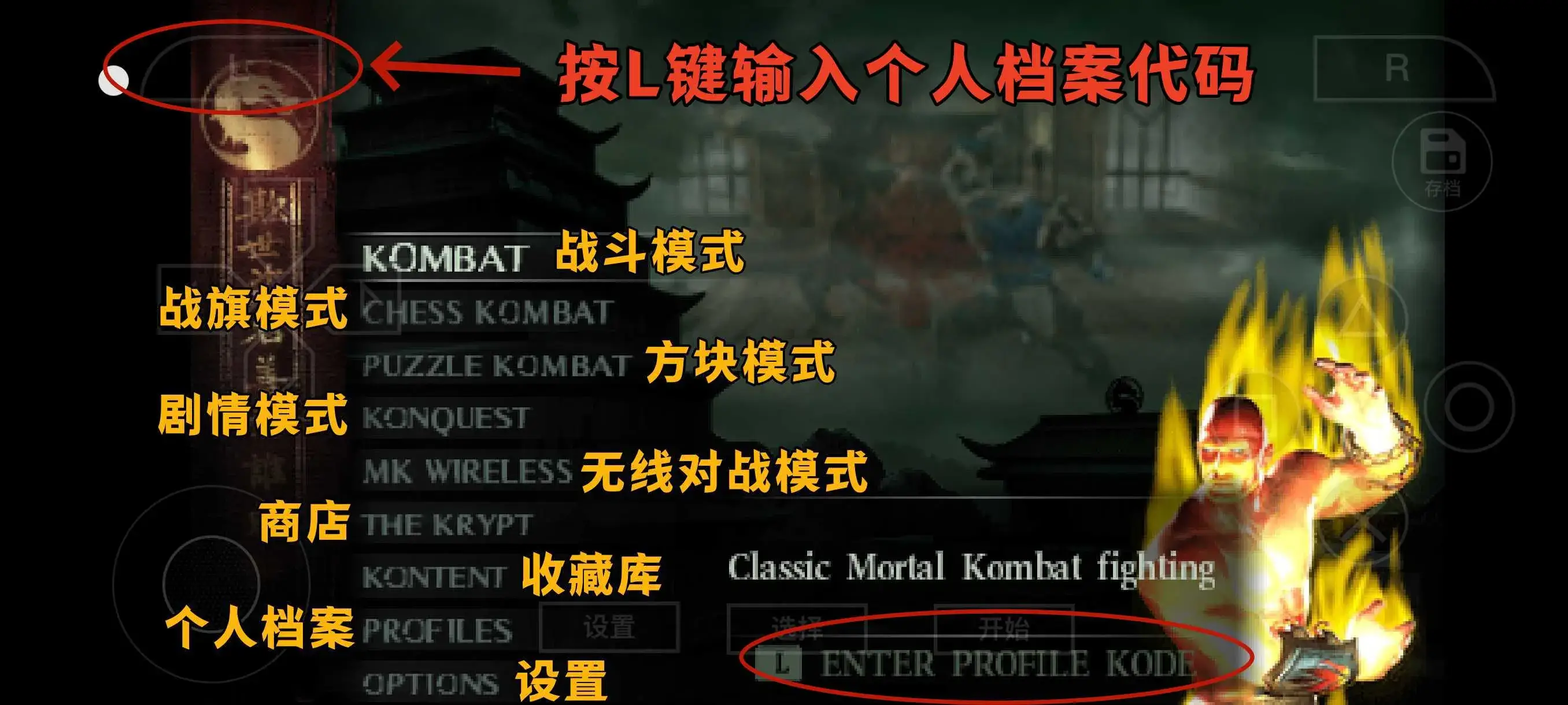 主界面各选项翻译 ※注意:KONQUEST (剧情模式)、MK WIRELESS (无线对战)、THE KRYPT (墓地)、KONTENT (内容库)这四个选…